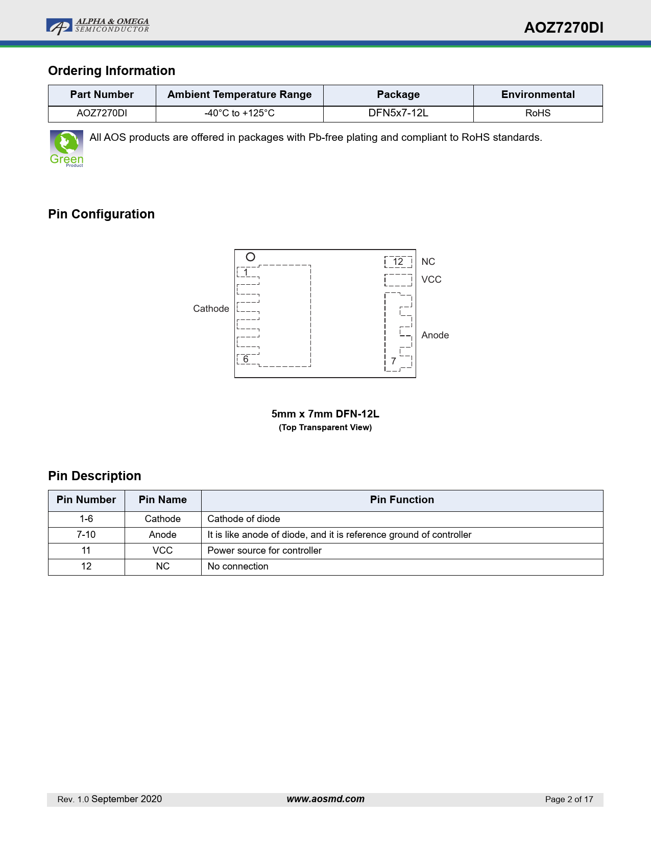 Pages / Page17 / 2 — AOZ7270DI. Ordering Information. Part Number. Ambient Temperature Range. …