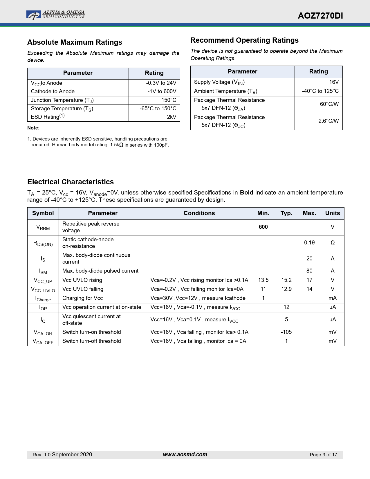 AOZ7270DI. Absolute Maximum Ratings. Recommend Operating Ratings. Parameter. Rating. Note:. Electrical Characteristics. Bold. Symbol