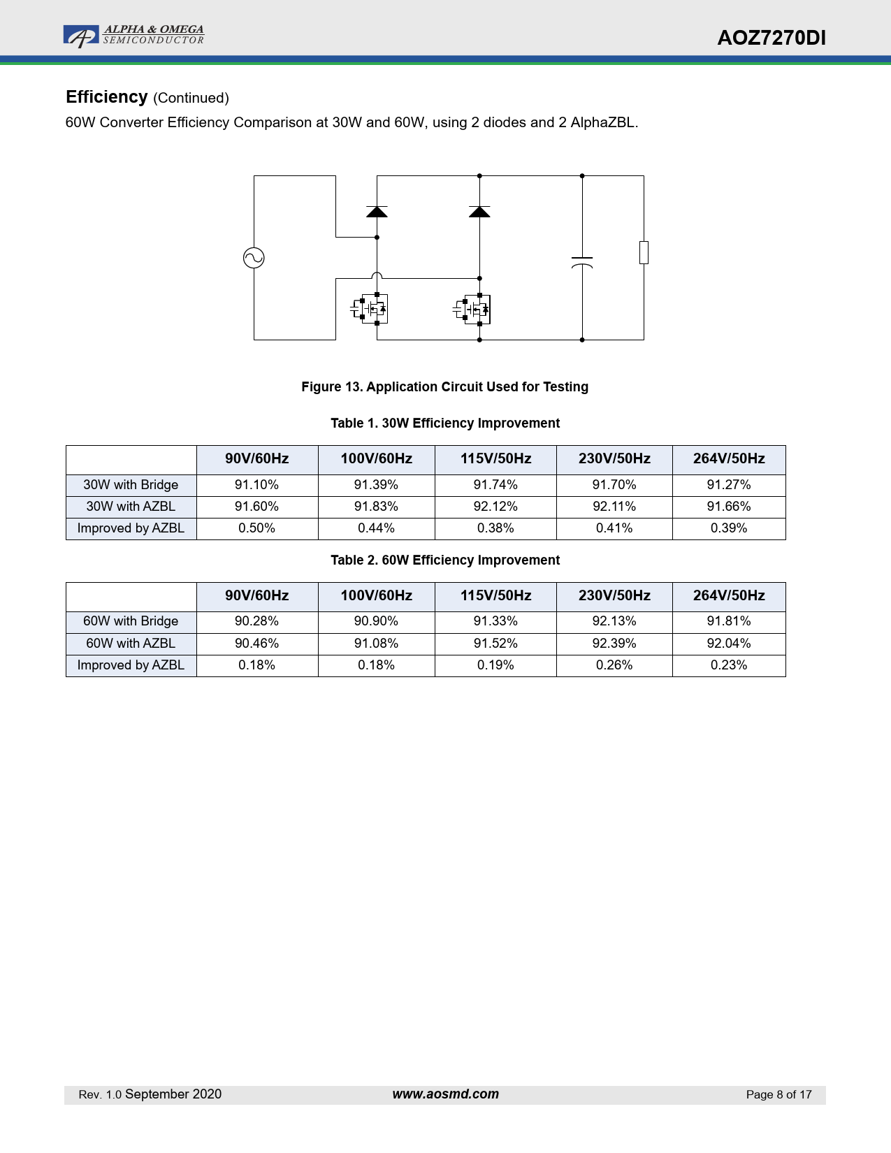 AOZ7270DI. Efficiency. Figure 13. Application Circuit Used for Testing. Table 1. 30W Efficiency Improvement. 90V/60Hz. 100V/60Hz