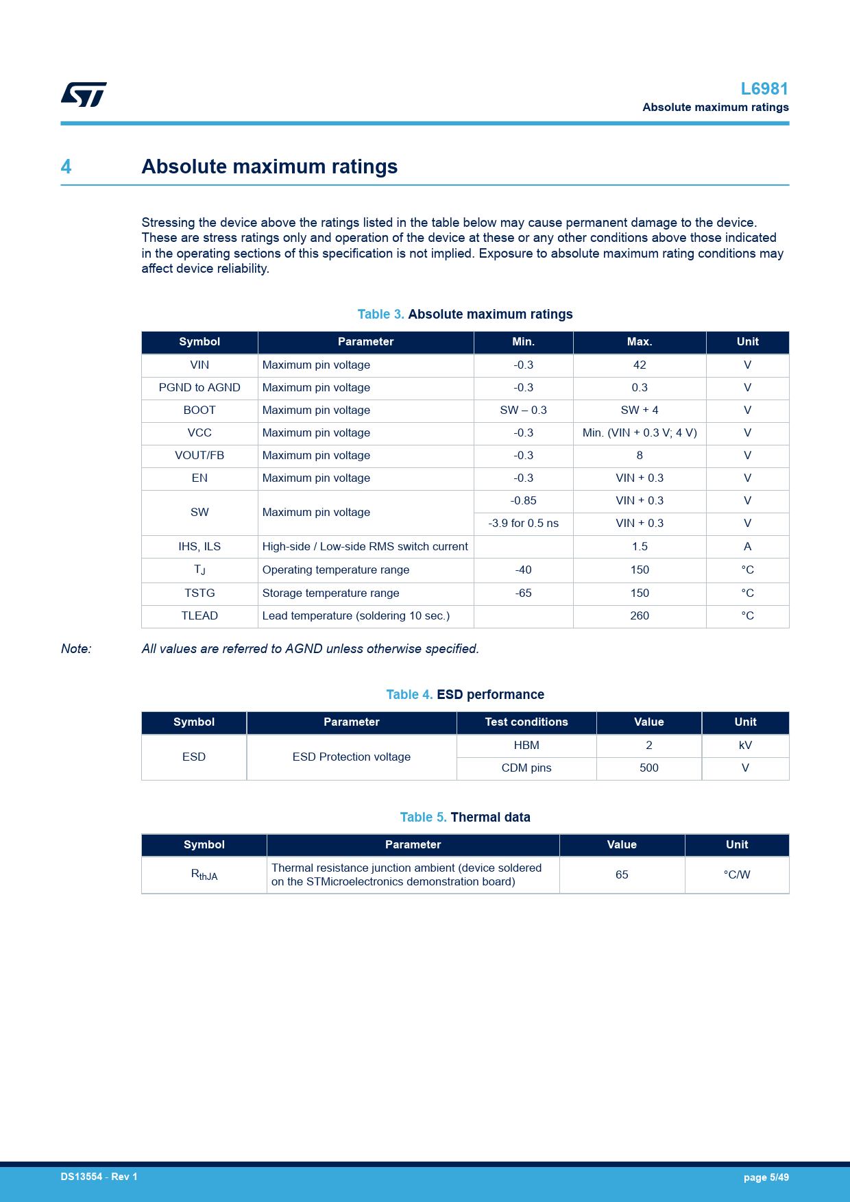 L6981. Absolute maximum ratings. Table 3. Absolute maximum ratings. Symbol. Parameter. Min. Max. Unit. Table 4. ESD performance