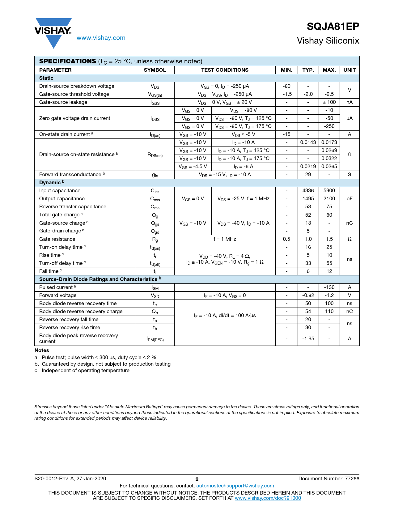 SQJA81EP www.vishay.com Vishay Siliconix SPECIFICATIONS (TC = 25 °C, unless otherwise noted) PARAMETERSYMBOLTEST CONDITIONSMIN.TYP.MAX.UNITStatic Drain-source breakdown voltage VDS VGS = 0, ID = -250 μA -80 - - V Gate-source threshold voltage VGS(th) VDS = VGS, ID = -250 μA -1.5 -2.0 -2.5 Gate-source leakage IGSS VDS = 0 V, VGS = ± 20 V - - ± 100 nA VGS = 0 V VDS = -80 V - - -10 Zero gate voltage drain current IDSS VGS = 0 V VDS = -80 V, TJ = 125 °C - - -50 μA VGS = 0 V VDS = -80 V, TJ = 175 °C - - -250 On-state drain current a ID(on) VGS = -10 V VDS ≤ -5 V -15 - - A VGS = -10 V ID = -10 A - 0.0143 0.0173 VGS = -10 V ID = -10 A, TJ = 125 °C - - 0.0269 Drain-source on-state resistance a RDS(on) Ω VGS = -10 V ID = -10 A, TJ = 175 °C - - 0.0322 VGS = -4.5 V ID = -6 A - 0.0219 0.0265 Forward transconductance b gfs VDS = -15 V, ID = -10 A - 29 - S Dynamic b Input capacitance Ciss - 4336 5900 Output capacitance Coss VGS = 0 V VDS = -25 V, f = 1 MHz - 1495 2100 pF Reverse transfer capacitance Crss - 53 75 Total gate charge c Qg - 52 80 Gate-source charge c Qgs VGS = -10 V VDS = -40 V, ID = -10 A - 13 - nC Gate-drain charge c Qgd - 5 - Gate resistance Rg f = 1 MHz 0.5 1.0 1.5 Ω Turn-on delay time c td(on) - 16 25 Rise time c tr V - 5 10 DD = -40 V, RL = 4 Ω, ns I Turn-off delay time c t D ≅ -10 A, VGEN = -10 V, Rg = 1 Ω d(off) - 33 55 Fall time c tf - 6 12 Source-Drain Diode Ratings and Characteristics b Pulsed current a ISM - - -130 A Forward voltage VSD IF = -10 A, VGS = 0 - -0.82 -1.2 V Body diode reverse recovery time trr - 50 100 ns Body diode reverse recovery charge Qrr - 54 110 nC IF = -10 A, di/dt = 100 A/μs Reverse recovery fall time ta - 20 - ns Reverse recovery rise time tb - 30 - Body diode peak reverse recovery I current RM(REC) - -1.95 - A Notes a. Pulse test; pulse width ≤ 300 μs, duty cycle ≤ 2 % b. Guaranteed by design, not subject to production testing c. Independent of operating temperature Stresses beyond those listed under “Absolute Maximum Ratings” may cause permanent damage to the device. These are stress ratings only, and functional operation of the device at these or any other conditions beyond those indicated in the operational sections of the specifications is not implied. Exposure to absolute maximum rating conditions for extended periods may affect device reliability. S20-0012-Rev. A, 27-Jan-2020 2 Document Number: 77266 For technical questions, contact: automostechsupport@vishay.com THIS DOCUMENT IS SUBJECT TO CHANGE WITHOUT NOTICE. THE PRODUCTS DESCRIBED HEREIN AND THIS DOCUMENT ARE SUBJECT TO SPECIFIC DISCLAIMERS, SET FORTH AT www.vishay.com/doc?91000