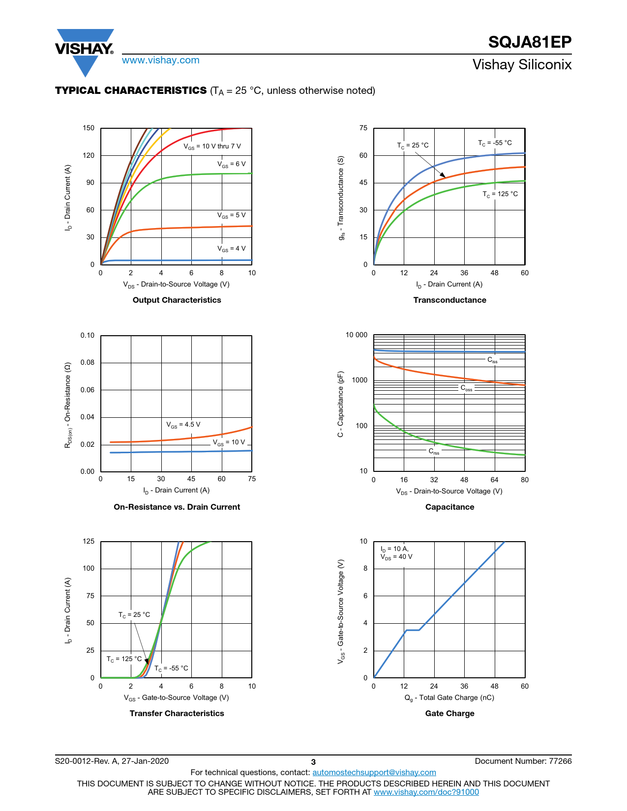 SQJA81EP www.vishay.com Vishay Siliconix TYPICAL CHARACTERISTICS (TA = 25 °C, unless otherwise noted) Axis Title Axis Title 150 10000 75 10000 T = -55 °C V = 10 V thru 7 V C T = 25 °C GS C 120 ) 60 ) V = 6 V GS 1000 1000 90 45 rrent (A ne ne ine u ne ne ine T = 125 °C C C n 1st li 2nd li 2nd l 1st li 2nd li 60 2nd l rai 30 D V = 5 V GS 100 - ransconductance (S 100 T I D - 30 fsg 15 V = 4 V GS 0 10 0 10 0 2 4 6 8 10 0 12 24 36 48 60 V - Drain-to-Source Voltage (V) I - Drain Current (A) DS D Output CharacteristicsTransconductance Axis Title Axis Title 0.10 10000 10 000 10000 ) 0.08 Ciss Ω 1000 1000 1000 (pF) 0.06 Coss ne ne ne ine ne ine tance 1st li n-Resistance ( 2nd li 1st li 2nd l 2nd li 0.04 2nd l O apaci - V = 4.5 V C GS 100 100 100 (on) C - S D 0.02 V = 10 V R GS Crss 0.00 10 10 10 0 15 30 45 60 75 0 16 32 48 64 80 I - Drain Current (A) D V - Drain-to-Source Voltage (V) DS On-Resistance vs. Drain CurrentCapacitance Axis Title Axis Title 125 10000 10 10000 I = 10 A, D ) V = 40 V DS 100 (V 8 ) 1000 ltage o 1000 75 6 rrent (A ne ne ine u ne ne ine C ource V n T = 25 °C C 1st li 2nd li 2nd l 1st li 2nd li 50 rai 2nd l 4 D 100 - 100 ate-to-S I D G 25 - 2 T = 125 °C GS C V T = -55 °C C 0 10 0 10 0 2 4 6 8 10 0 12 24 36 48 60 V - Gate-to-Source Voltage (V) Q - Total Gate Charge (nC) GS g Transfer CharacteristicsGate Charge S20-0012-Rev. A, 27-Jan-2020 3 Document Number: 77266 For technical questions, contact: automostechsupport@vishay.com THIS DOCUMENT IS SUBJECT TO CHANGE WITHOUT NOTICE. THE PRODUCTS DESCRIBED HEREIN AND THIS DOCUMENT ARE SUBJECT TO SPECIFIC DISCLAIMERS, SET FORTH AT www.vishay.com/doc?91000