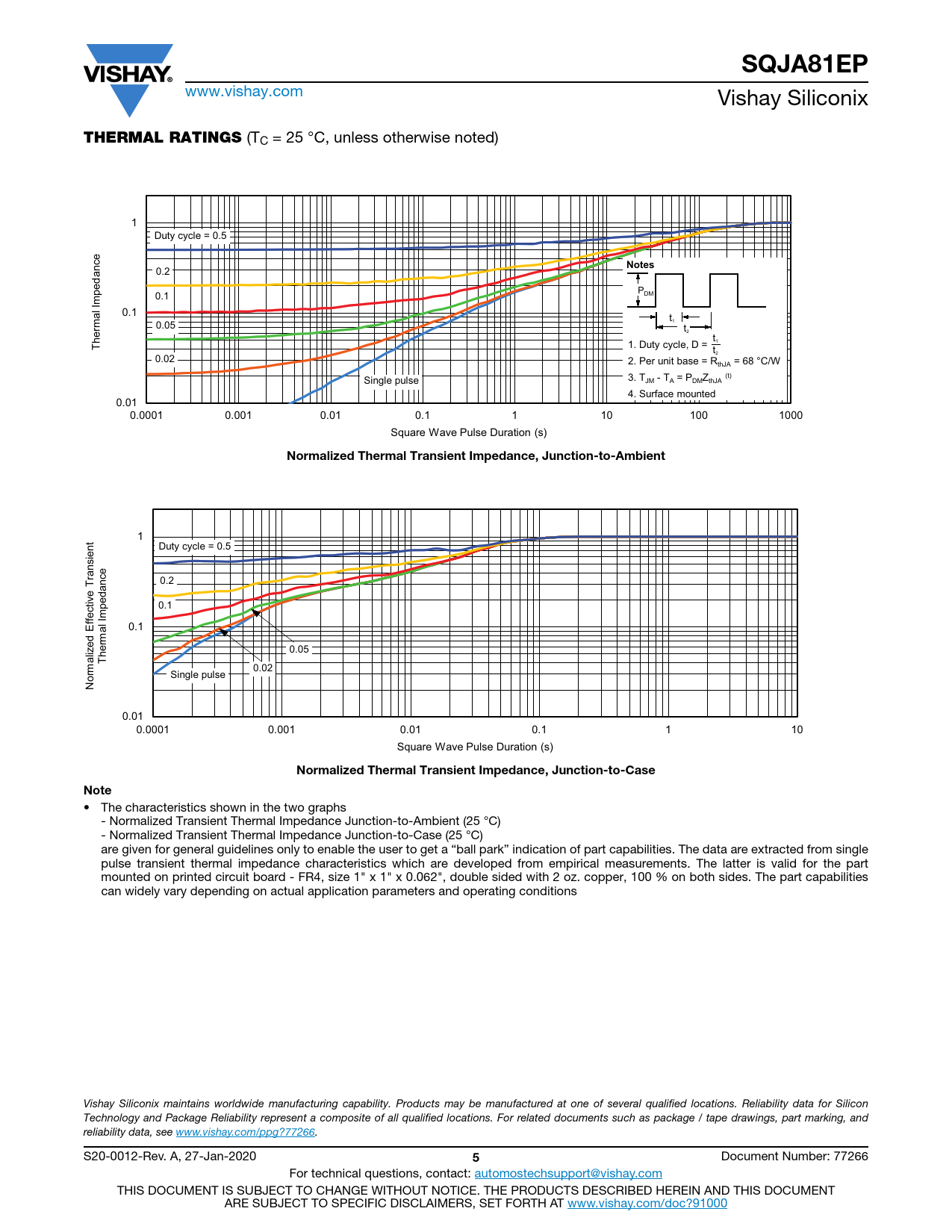 SQJA81EP www.vishay.com Vishay Siliconix THERMAL RATINGS (TC = 25 °C, unless otherwise noted) Axis Title 10000 1 Duty cycle = 0.5 Notes 1000 0.2 pedance PDM ne ne m 0.1 l I 0.1 1st li a 2nd li t1 0.05 t erm 2 100 h t1 T 1. Duty cycle, D = t2 0.02 2. Per unit base = R = 68 °C/W thJA (t) Single pulse 3. T - T = P Z JM A DM thJA 4. Surface mounted 0.01 10 0.0001 0.001 0.01 0.1 1 10 100 1000 Square Wave Pulse Duration (s) Normalized Thermal Transient Impedance, Junction-to-Ambient Axis Title 10000 1 Duty cycle = 0.5 ent ransi 1000 T 0.2 e v pedance 0.1 ne ne m ffecti l I 0.1 1st li a 2nd li ed E erm 0.05 100 iz h al T 0.02 Single pulse Norm 0.01 10 0.0001 0.001 0.01 0.1 1 10 Square Wave Pulse Duration (s) Normalized Thermal Transient Impedance, Junction-to-CaseNote • The characteristics shown in the two graphs - Normalized Transient Thermal Impedance Junction-to-Ambient (25 °C) - Normalized Transient Thermal Impedance Junction-to-Case (25 °C) are given for general guidelines only to enable the user to get a “ball park” indication of part capabilities. The data are extracted from single pulse transient thermal impedance characteristics which are developed from empirical measurements. The latter is valid for the part mounted on printed circuit board - FR4, size 1" x 1" x 0.062", double sided with 2 oz. copper, 100 % on both sides. The part capabilities can widely vary depending on actual application parameters and operating conditions Vishay Siliconix maintains worldwide manufacturing capability. Products may be manufactured at one of several qualified locations. Reliability data for Silicon Technology and Package Reliability represent a composite of all qualified locations. For related documents such as package / tape drawings, part marking, and reliability data, see www.vishay.com/ppg?77266. S20-0012-Rev. A, 27-Jan-2020 5 Document Number: 77266 For technical questions, contact: automostechsupport@vishay.com THIS DOCUMENT IS SUBJECT TO CHANGE WITHOUT NOTICE. THE PRODUCTS DESCRIBED HEREIN AND THIS DOCUMENT ARE SUBJECT TO SPECIFIC DISCLAIMERS, SET FORTH AT www.vishay.com/doc?91000
