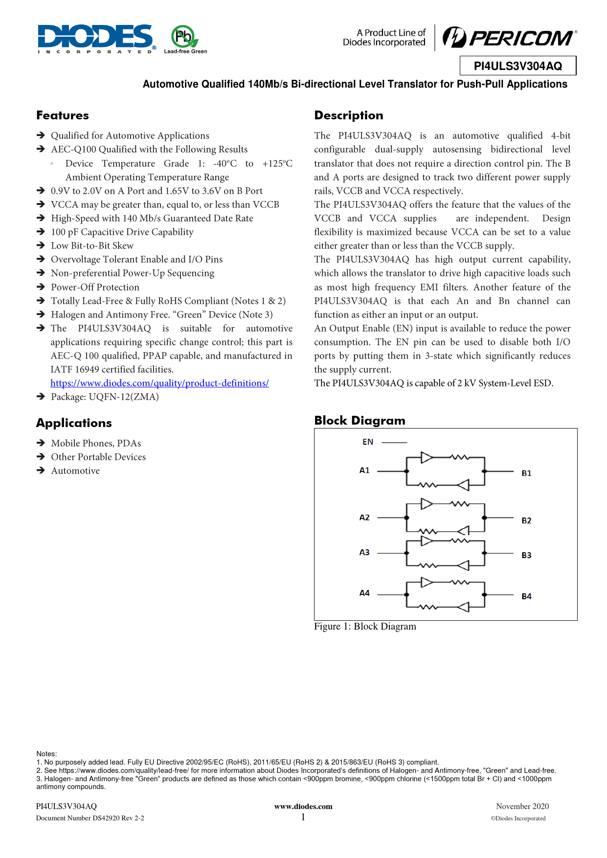 PI4ULS3V304AQ. Automotive Qualified 140Mb/s Bi-directional Level Translator for Push-Pull Applications. Features. Description