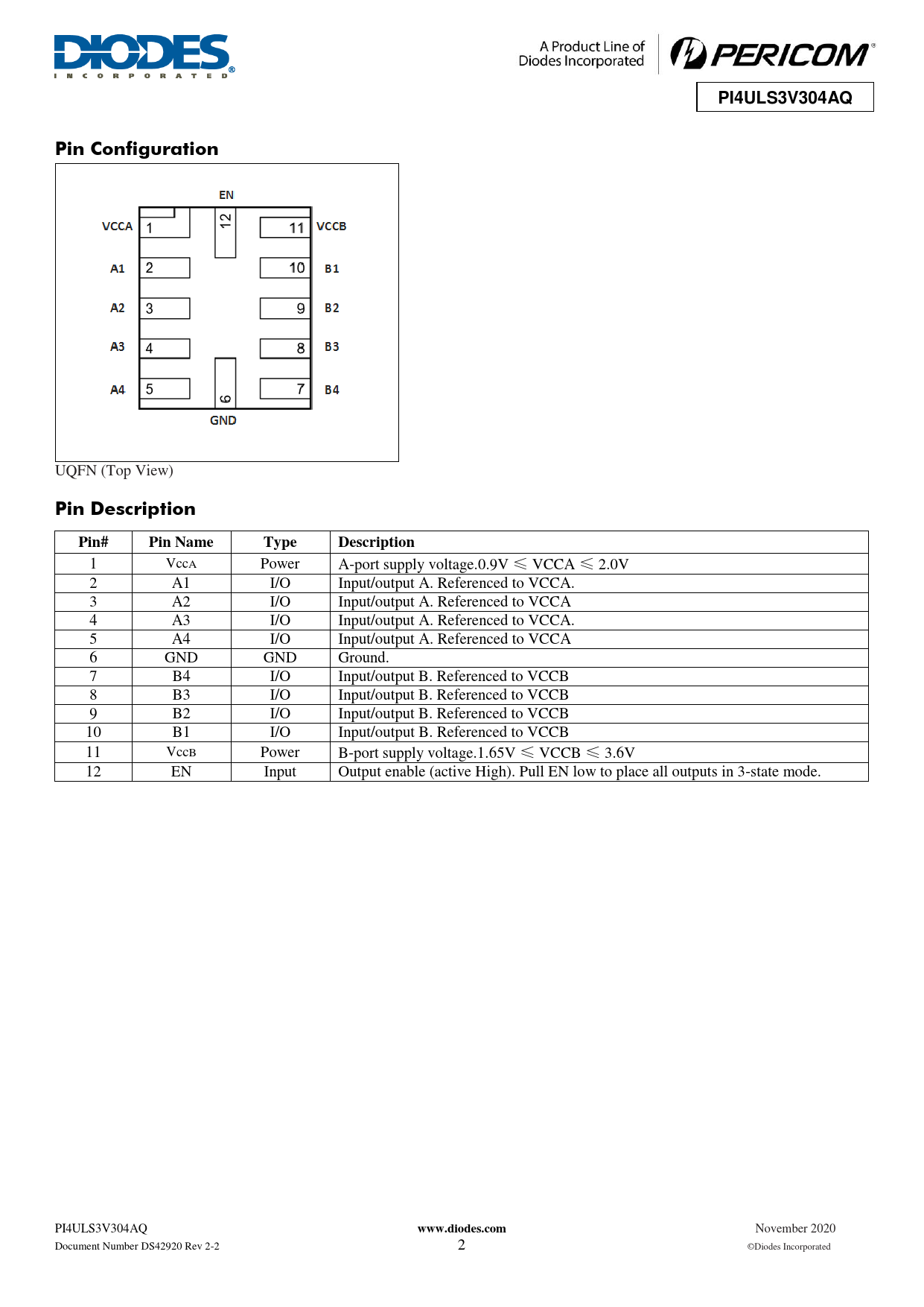 1 VccA Power A-port supply voltage.0.9V ≤ VCCA ≤ 2.0V 2 A1 I/O Input/output A. Referenced to VCCA. 3 A2 I/O Input/output A. Referenced to VCCA 4 A3 I/O Input/output A. Referenced to VCCA. 5 A4 I/O Input/output A. Referenced to VCCA 6 GND GND Ground. 7 B4 I/O Input/output B. Referenced to VCCB 8 B3 I/O Input/output B. Referenced to VCCB 9 B2 I/O Input/output B. Referenced to VCCB 10 B1 I/O Input/output B. Referenced to VCCB 11 VccB Power B-port supply voltage.1.65V ≤ VCCB ≤ 3.6V 12 EN Input Output enable (active High). Pull EN low to place all outputs in 3-state mode. PI4ULS3V304AQ