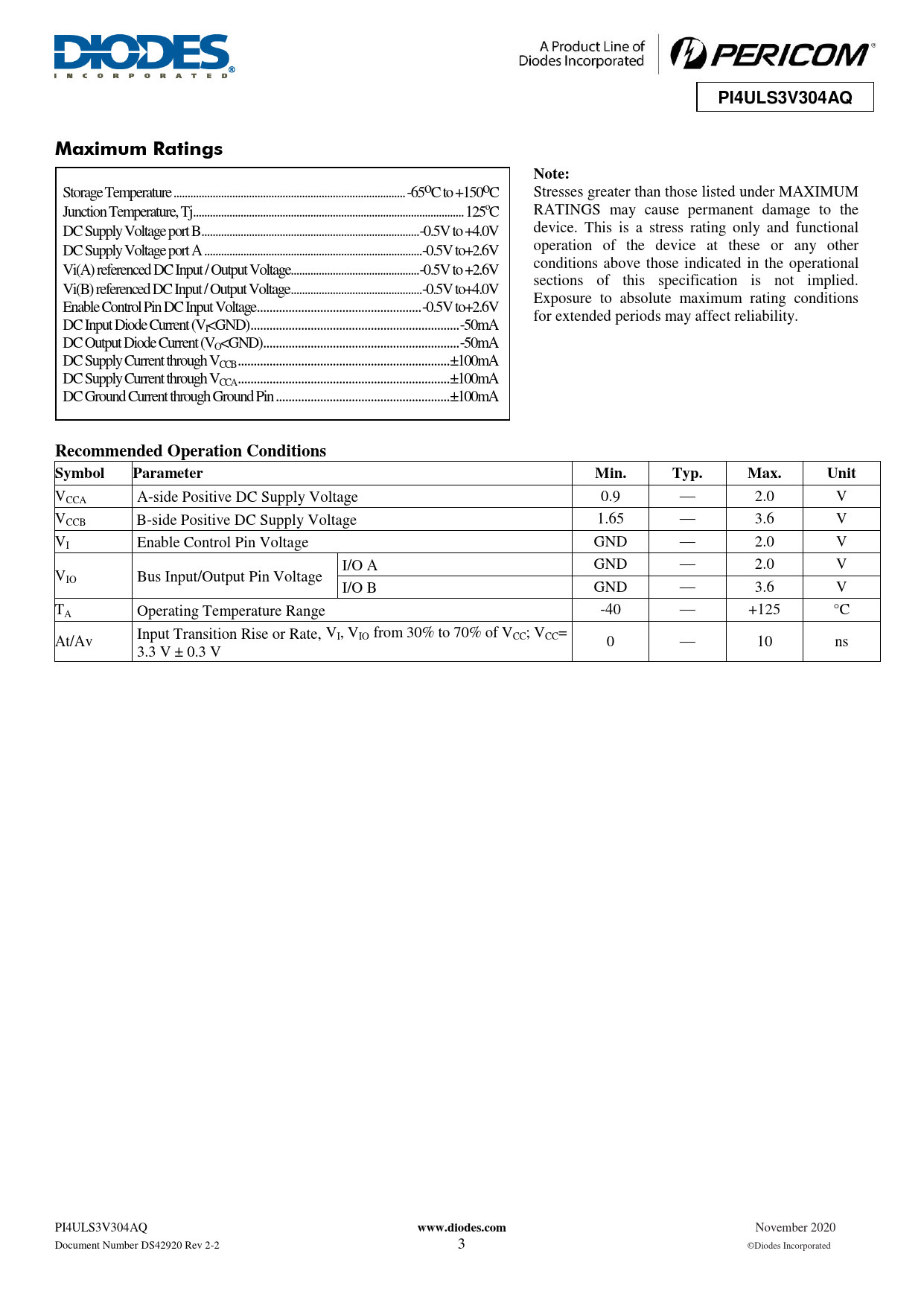 PI4ULS3V304AQ. Maximum Ratings. Note:. Recommended Operation Conditions Symbol. Parameter. Min. Typ. Max. Unit. www.diodes.com