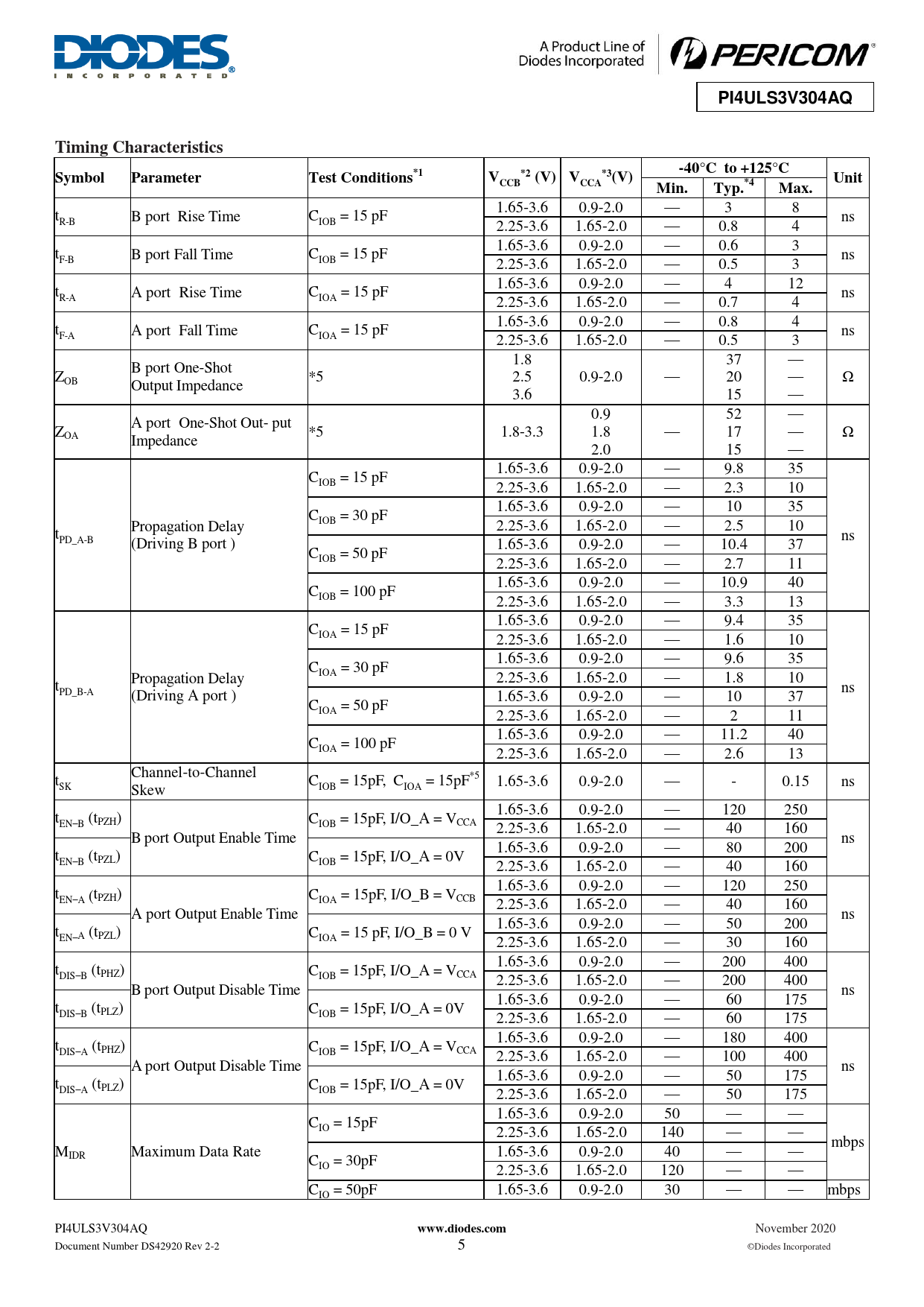 PI4ULS3V304AQ Timing Characteristics -40°C to +125°C Symbol Parameter Test Conditions*1 V *2 *3(V) CCB (V) VCCA Unit Min. Typ.*4 Max.
