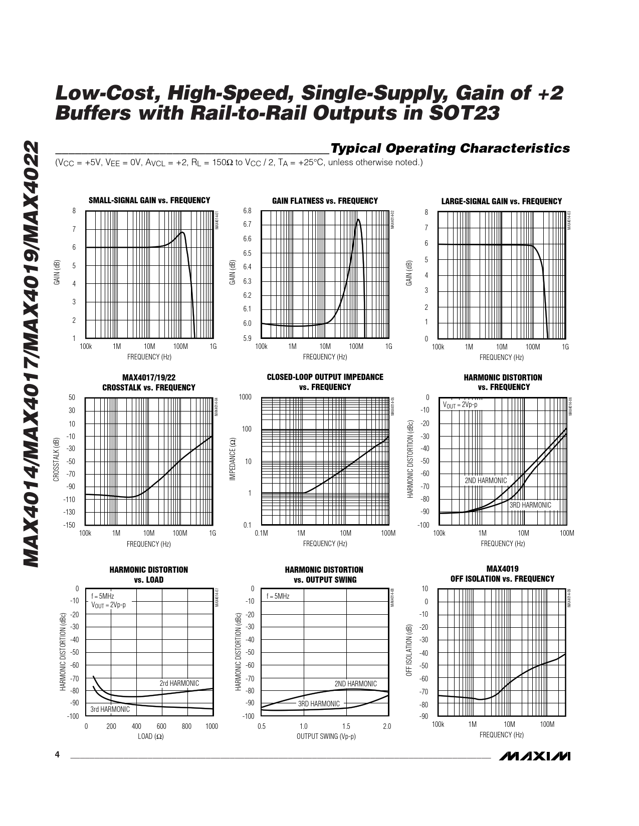 MAX4014/MAX4017/MAX4019/MAX4022 HARMONIC DISTORTION HARMONIC DISTORTION MAX4019 vs. LOAD vs. OUTPUT SWING OFF ISOLATION vs. FREQUENCY