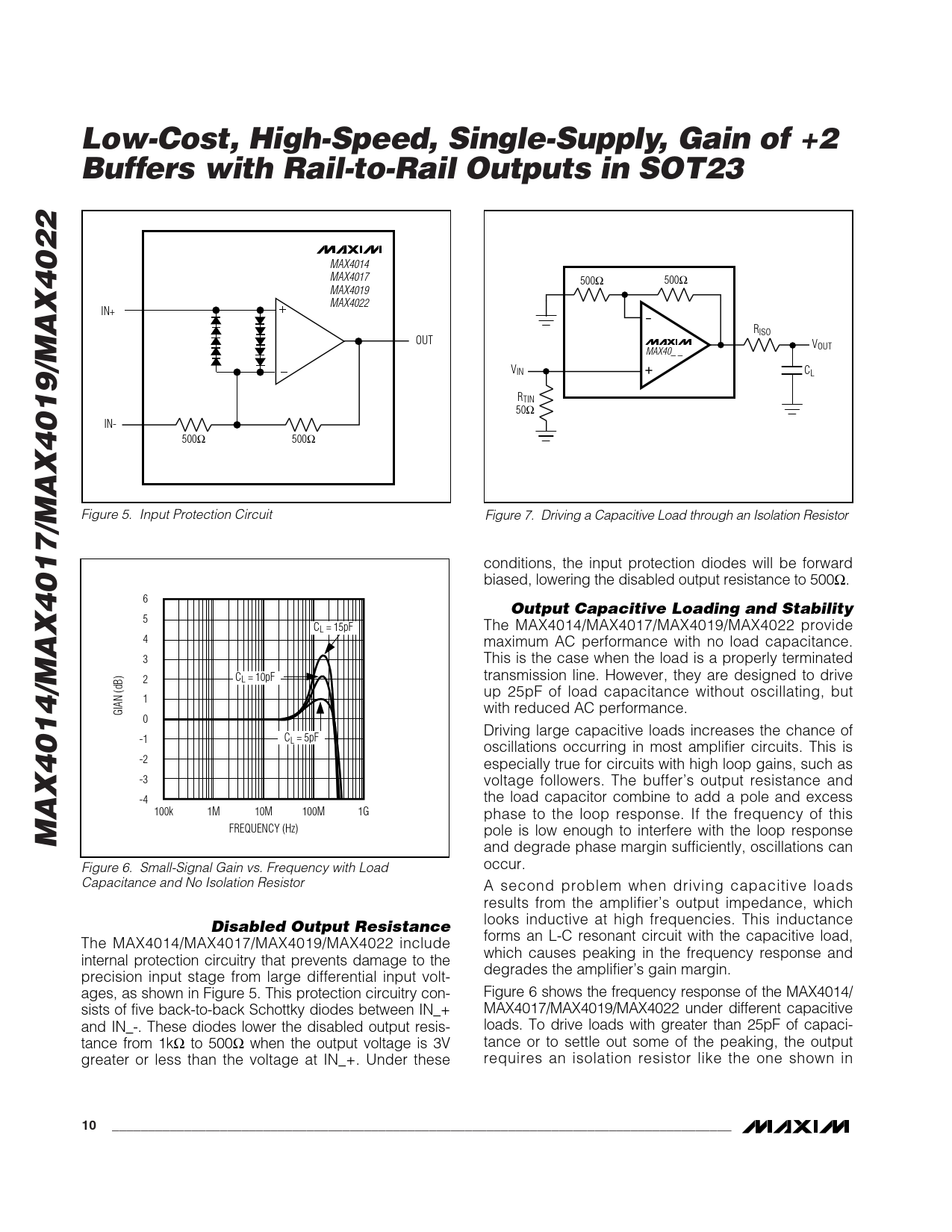 Low-Cost, High-Speed, Single-Supply, Gain of +2 Buffers with Rail-to-Rail Outputs in SOT23 MAX4014 MAX4017 500Ω 500Ω MAX4019 MAX4022 IN+ RISO OUT VOUT MAX40_ _ VIN CL RTIN 50Ω IN- 500Ω 500Ω Figure 5. Input Protection Circuit Figure 7. Driving a Capacitive Load through an Isolation Resistor conditions, the input protection diodes will be forward biased, lowering the disabled output resistance to 500Ω. 6 Output Capacitive Loading and Stability 5 CL = 15pF The MAX4014/MAX4017/MAX4019/MAX4022 provide 4 maximum AC performance with no load capacitance. 3 This is the case when the load is a properly terminated 2 CL = 10pF transmission line. However, they are designed to drive up 25pF of load capacitance without oscillating, but 1 GIAN (dB) with reduced AC performance. 0 Driving large capacitive loads increases the chance of -1 CL = 5pF oscillations occurring in most amplifier circuits. This is -2 especially true for circuits with high loop gains, such as -3 voltage followers. The buffer’s output resistance and -4 the load capacitor combine to add a pole and excess 100k 1M 10M 100M 1G phase to the loop response. If the frequency of this MAX4014/MAX4017/MAX4019/MAX4022 FREQUENCY (Hz) pole is low enough to interfere with the loop response and degrade phase margin sufficiently, oscillations can occur. Figure 6. Small-Signal Gain vs. Frequency with Load Capacitance and No Isolation Resistor A second problem when driving capacitive loads results from the amplifier’s output impedance, which Disabled Output Resistance looks inductive at high frequencies. This inductance forms an L-C resonant circuit with the capacitive load, The MAX4014/MAX4017/MAX4019/MAX4022 include which causes peaking in the frequency response and internal protection circuitry that prevents damage to the degrades the amplifier’s gain margin. precision input stage from large differential input volt- ages, as shown in Figure 5. This protection circuitry con- Figure 6 shows the frequency response of the MAX4014/ sists of five back-to-back Schottky diodes between IN_+ MAX4017/MAX4019/MAX4022 under different capacitive and IN_-. These diodes lower the disabled output resis- loads. To drive loads with greater than 25pF of capaci- tance from 1kΩ to 500Ω when the output voltage is 3V tance or to settle out some of the peaking, the output greater or less than the voltage at IN_+. Under these requires an isolation resistor like the one shown in 10______________________________________________________________________________________