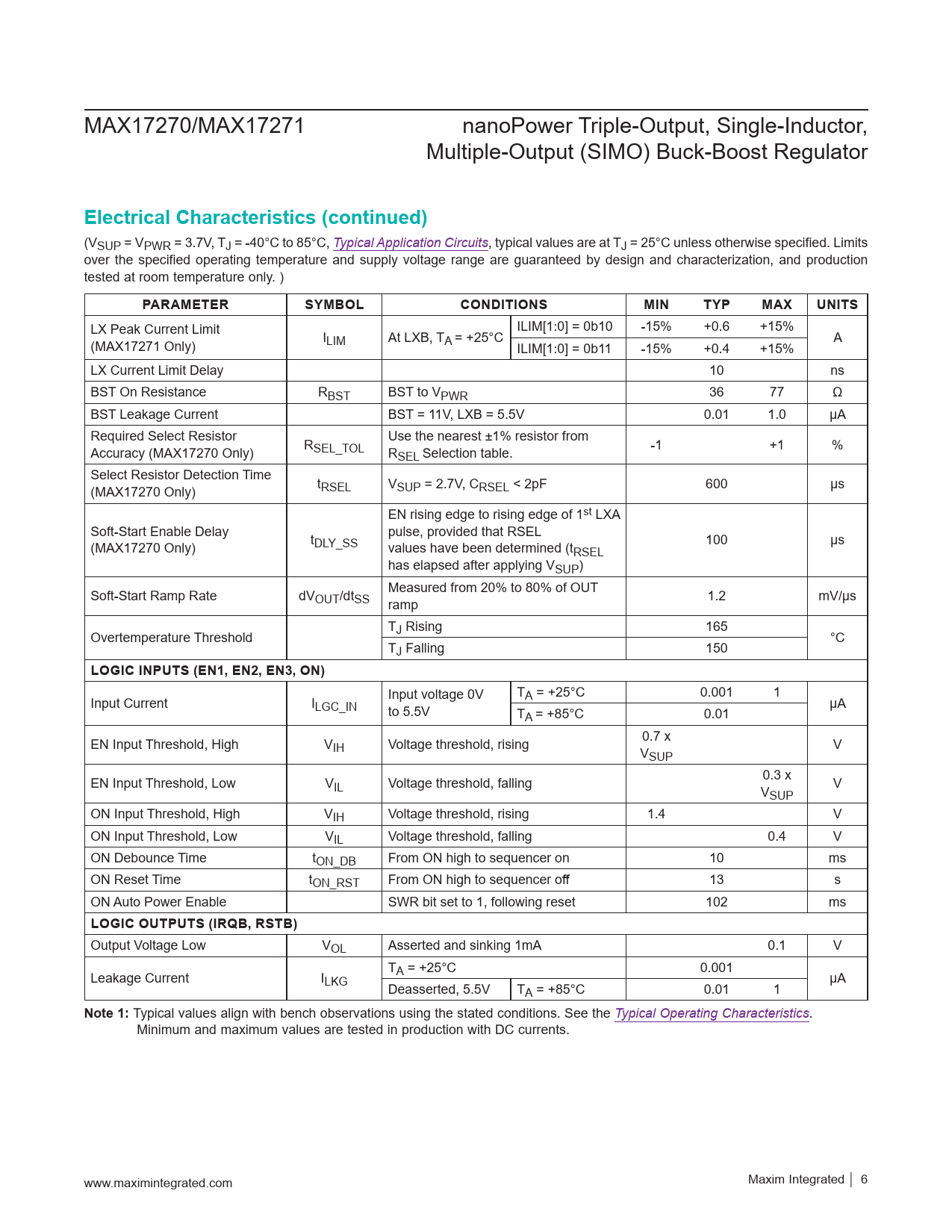 link to page 35 link to page 9 MAX17270/MAX17271 nanoPower Triple-Output, Single-Inductor, Multiple-Output (SIMO) Buck-Boost Regulator Electrical Characteristics (continued) (VSUP = VPWR = 3.7V, TJ = -40°C to 85°C, Typical Application Circuits, typical values are at TJ = 25°C unless otherwise specified. Limits over the specified operating temperature and supply voltage range are guaranteed by design and characterization, and production tested at room temperature only. ) PARAMETERSYMBOLCONDITIONSMINTYPMAXUNITS LX Peak Current Limit ILIM[1:0] = 0b10 -15% +0.6 +15% (MAX17271 Only) I LIM At LXB, TA = +25°C A ILIM[1:0] = 0b11 -15% +0.4 +15% LX Current Limit Delay 10 ns BST On Resistance RBST BST to VPWR 36 77 Ω BST Leakage Current BST = 11V, LXB = 5.5V 0.01 1.0 μA Required Select Resistor Use the nearest ±1% resistor from Accuracy (MAX17270 Only) RSEL_TOL RSEL Selection table. -1 +1 % Select Resistor Detection Time (MAX17270 Only) tRSEL VSUP = 2.7V, CRSEL < 2pF 600 μs EN rising edge to rising edge of 1st LXA Soft-Start Enable Delay pulse, provided that RSEL (MAX17270 Only) tDLY_SS values have been determined (t 100 μs RSEL has elapsed after applying VSUP) Soft-Start Ramp Rate dV Measured from 20% to 80% of OUT OUT/dtSS ramp 1.2 mV/μs T Overtemperature Threshold J Rising 165 °C TJ Falling 150 LOGIC INPUTS (EN1, EN2, EN3, ON) T Input Current I Input voltage 0V A = +25°C 0.001 1 LGC_IN to 5.5V μA TA = +85°C 0.01 EN Input Threshold, High VIH Voltage threshold, rising 0.7 x V V SUP EN Input Threshold, Low VIL Voltage threshold, falling 0.3 x V V SUP ON Input Threshold, High VIH Voltage threshold, rising 1.4 V ON Input Threshold, Low VIL Voltage threshold, falling 0.4 V ON Debounce Time tON_DB From ON high to sequencer on 10 ms ON Reset Time tON_RST From ON high to sequencer off 13 s ON Auto Power Enable SWR bit set to 1, following reset 102 ms LOGIC OUTPUTS (IRQB, RSTB) Output Voltage Low VOL Asserted and sinking 1mA 0.1 V T Leakage Current I A = +25°C 0.001 LKG μA Deasserted, 5.5V TA = +85°C 0.01 1 Note 1: Typical values align with bench observations using the stated conditions. See the Typical Operating Characteristics. Minimum and maximum values are tested in production with DC currents. www.maximintegrated.com Maxim Integrated │ 6