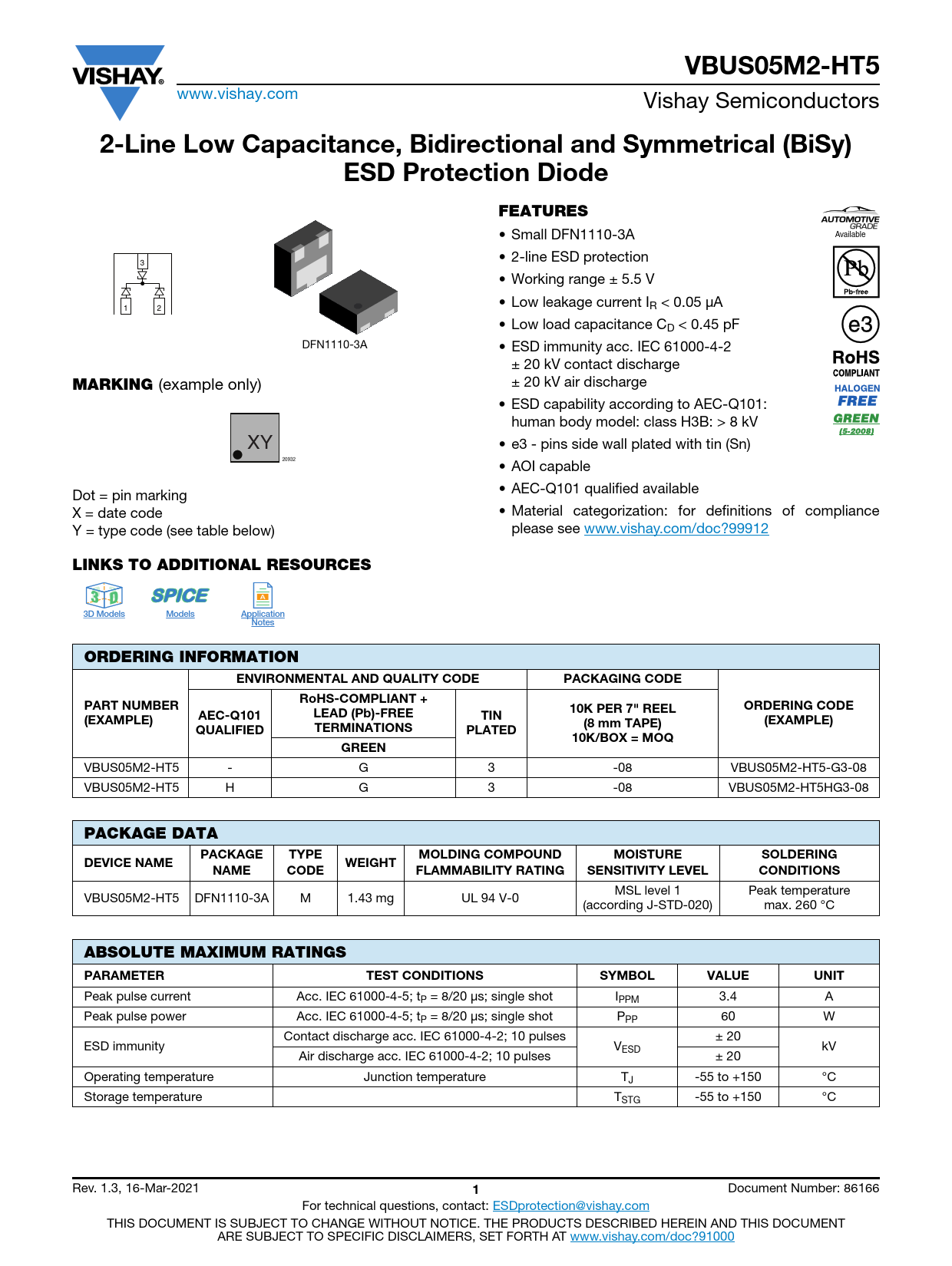 VBUS05M2-HT5 www.vishay.com Vishay Semiconductors 2-Line Low Capacitance, Bidirectional and Symmetrical (BiSy)ESD Protection DiodeFEATURES • Small DFN1110-3A Available • 2-line ESD protection 3 • Working range ± 5.5 V • Low leakage current I 1 2 R < 0.05 μA • Low load capacitance CD < 0.45 pF DFN1110-3A • ESD immunity acc. IEC 61000-4-2 ± 20 kV contact discharge MARKING (example only) ± 20 kV air discharge • ESD capability according to AEC-Q101: human body model: class H3B: > 8 kV XY • e3 - pins side wall plated with tin (Sn) 20932 • AOI capable • AEC-Q101 qualified available Dot = pin marking X = date code • Material categorization: for definitions of compliance Y = type code (see table below) please see www.vishay.com/doc?99912 LINKS TO ADDITIONAL RESOURCESD 33 D3D ModelsModelsApplicationNotesORDERING INFORMATIONENVIRONMENTAL AND QUALITY CODEPACKAGING CODERoHS-COMPLIANT +PART NUMBERORDERING CODELEAD (Pb)-FREE10K PER 7" REEL(EXAMPLE)AEC-Q101TIN(EXAMPLE)(8 mm TAPE)QUALIFIEDTERMINATIONSPLATED10K/BOX = MOQGREEN VBUS05M2-HT5 - G 3 -08 VBUS05M2-HT5-G3-08 VBUS05M2-HT5 H G 3 -08 VBUS05M2-HT5HG3-08 PACKAGE DATAPACKAGETYPEMOLDING COMPOUNDMOISTURESOLDERINGDEVICE NAMEWEIGHTNAMECODEFLAMMABILITY RATINGSENSITIVITY LEVELCONDITIONS MSL level 1 Peak temperature VBUS05M2-HT5 DFN1110-3A M 1.43 mg UL 94 V-0 (according J-STD-020) max. 260 °C ABSOLUTE MAXIMUM RATINGS PARAMETERTEST CONDITIONSSYMBOLVALUEUNIT Peak pulse current Acc. IEC 61000-4-5; tP = 8/20 μs; single shot IPPM 3.4 A Peak pulse power Acc. IEC 61000-4-5; tP = 8/20 μs; single shot PPP 60 W Contact discharge acc. IEC 61000-4-2; 10 pulses ± 20 ESD immunity VESD kV Air discharge acc. IEC 61000-4-2; 10 pulses ± 20 Operating temperature Junction temperature TJ -55 to +150 °C Storage temperature TSTG -55 to +150 °C Rev. 1.3, 16-Mar-2021 1 Document Number: 86166 For technical questions, contact: ESDprotection@vishay.com THIS DOCUMENT IS SUBJECT TO CHANGE WITHOUT NOTICE. THE PRODUCTS DESCRIBED HEREIN AND THIS DOCUMENT ARE SUBJECT TO SPECIFIC DISCLAIMERS, SET FORTH AT www.vishay.com/doc?91000