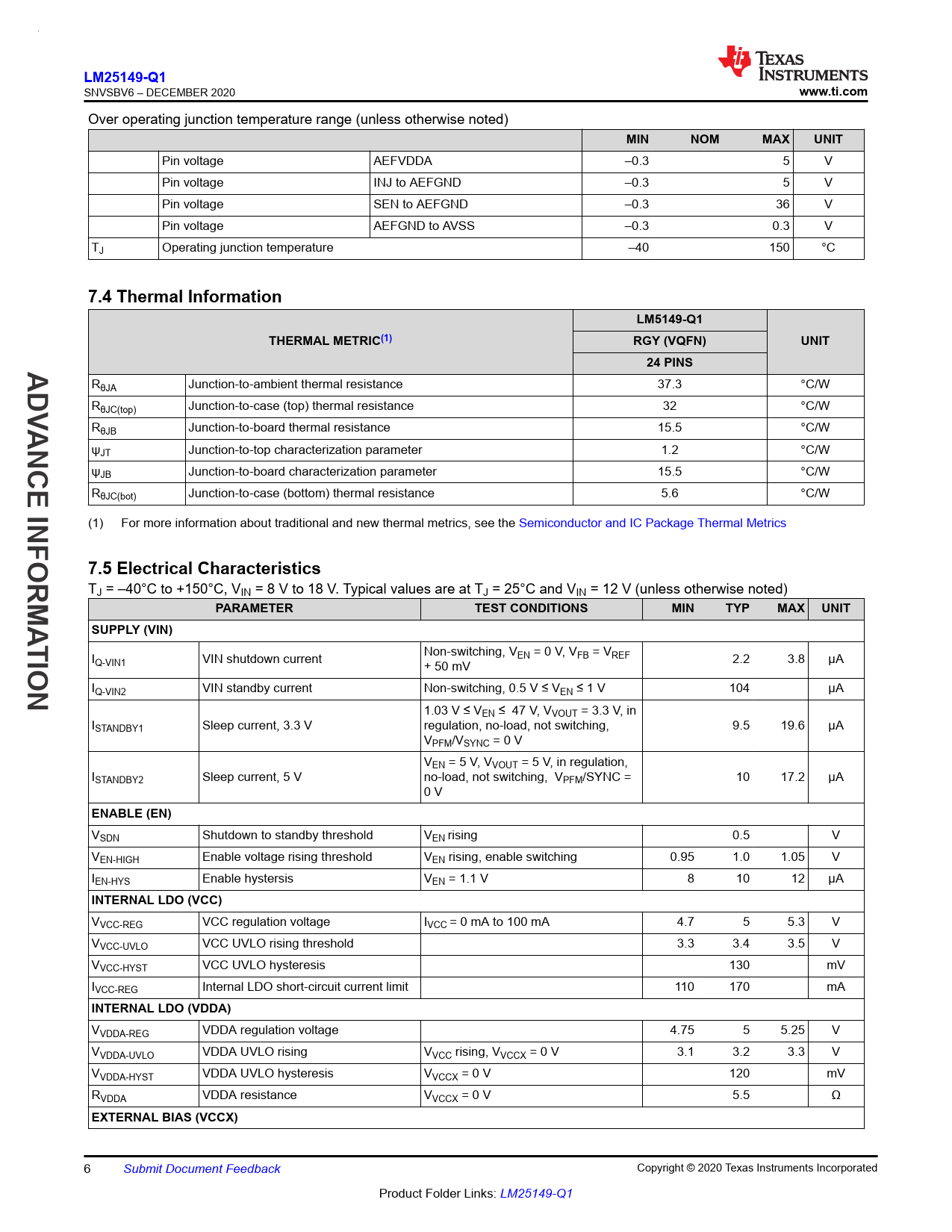 LM25149-Q1. www.ti.com. MIN. NOM. MAX. UNIT. 7.4 Thermal Information. LM5149-Q1. THERMAL METRIC(1). RGY (VQFN). 24 PINS. NCE INFO