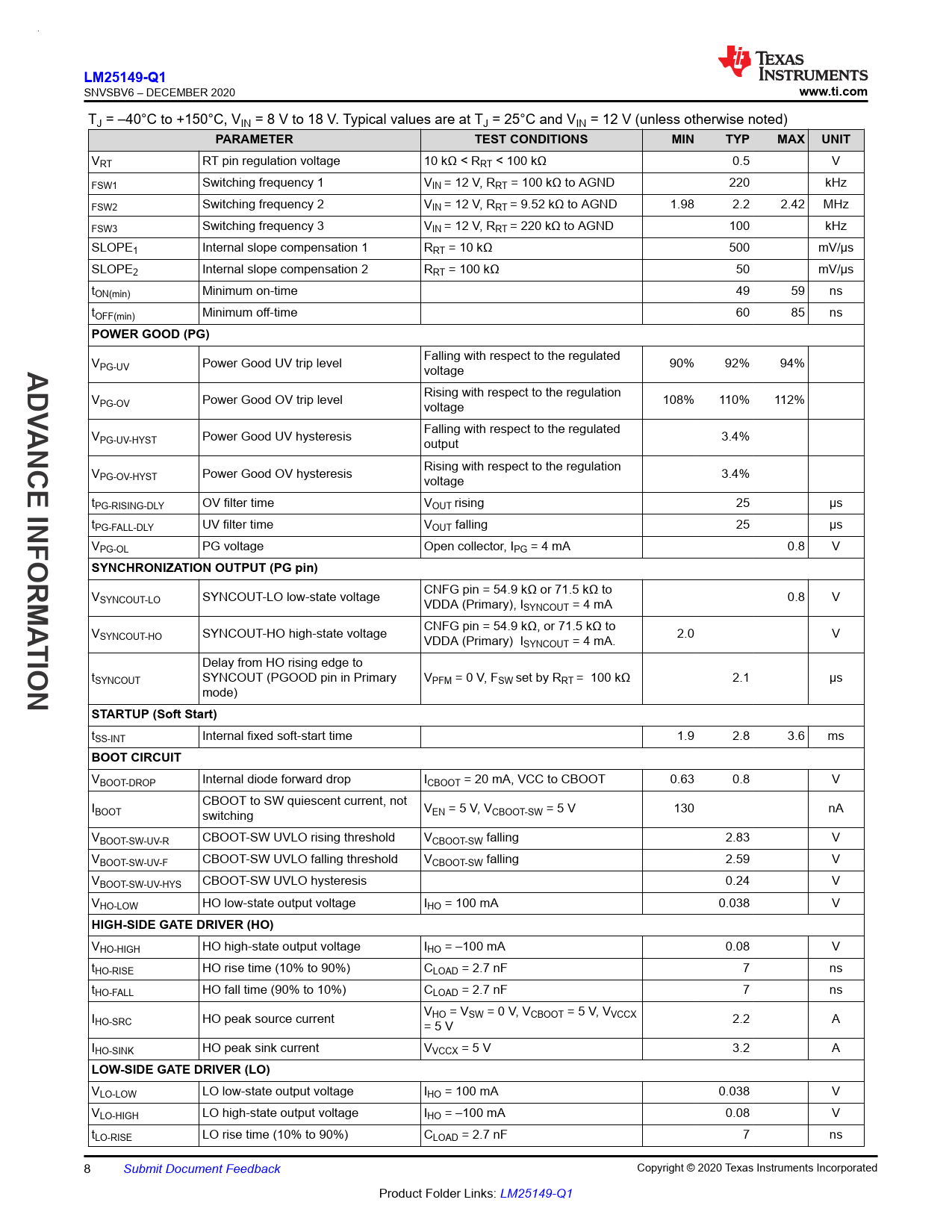 LM25149-Q1. www.ti.com. PARAMETER. TEST CONDITIONS. MIN. TYP. MAX. UNIT. POWER GOOD (PG). NCE INFO. SYNCHRONIZATION OUTPUT (PG pin). TION