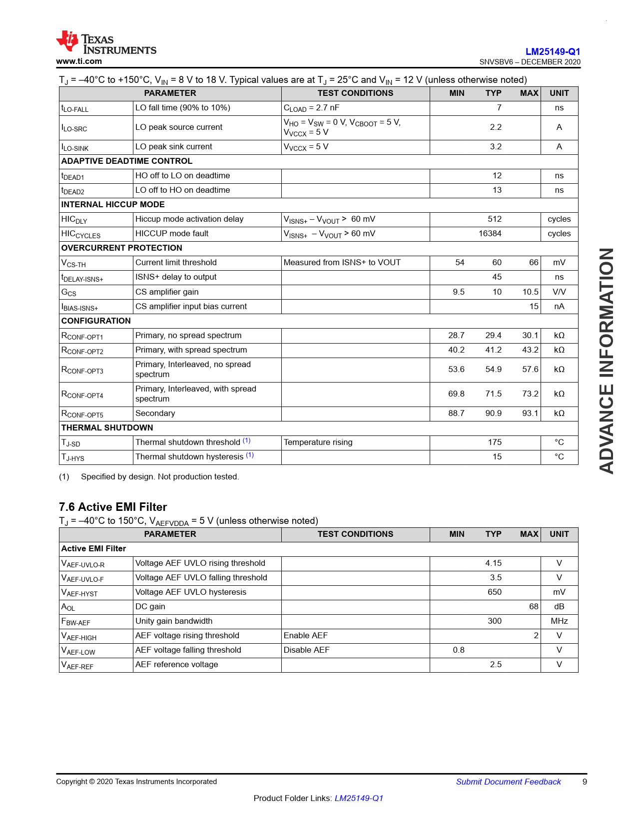 LM25149-Q1. www.ti.com. PARAMETER. TEST CONDITIONS. MIN. TYP. MAX. UNIT. ADAPTIVE DEADTIME CONTROL. INTERNAL HICCUP MODE