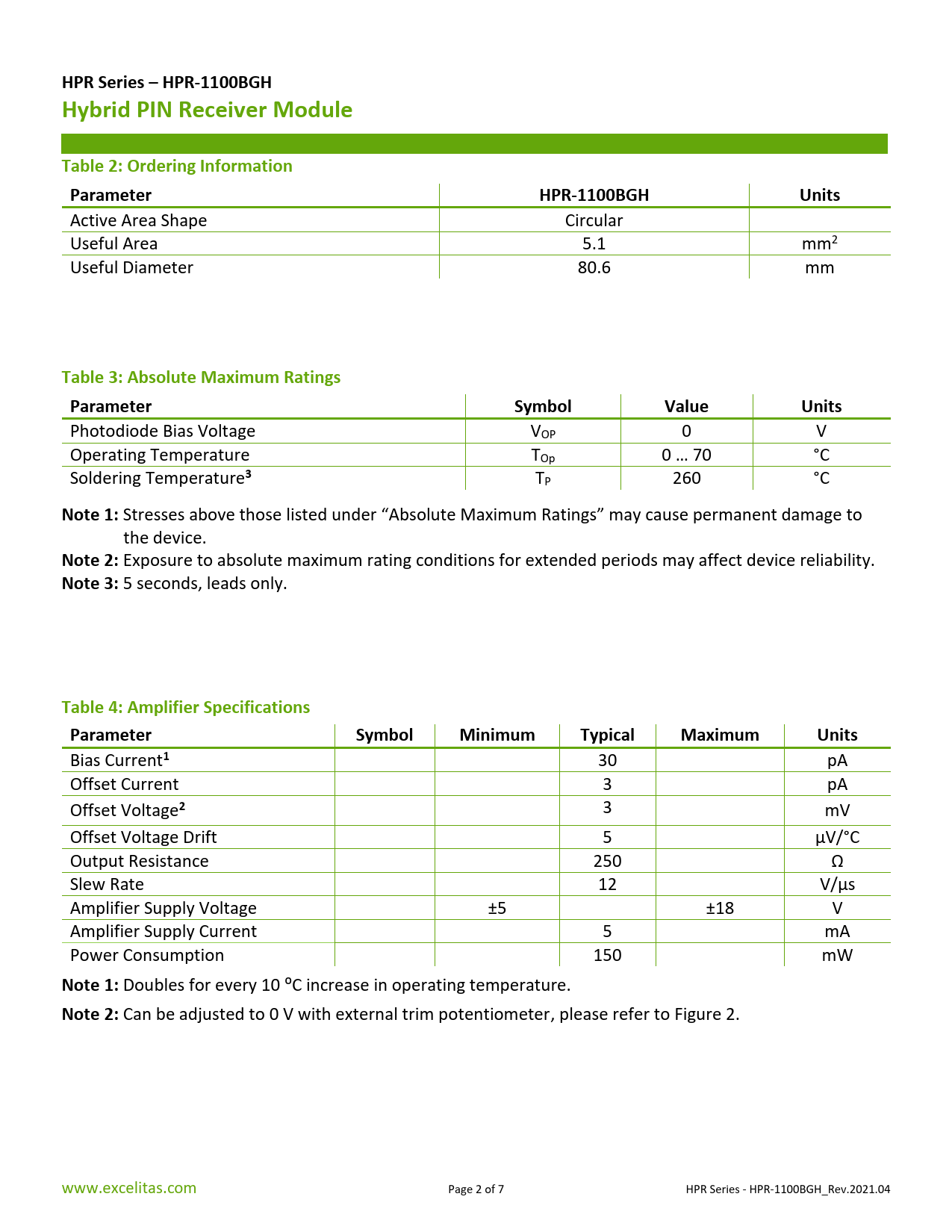 Pages / Page7 / 2 — HPR Series – HPR-1100BGH. Hybrid PIN Receiver Module. Table 2: Ordering …