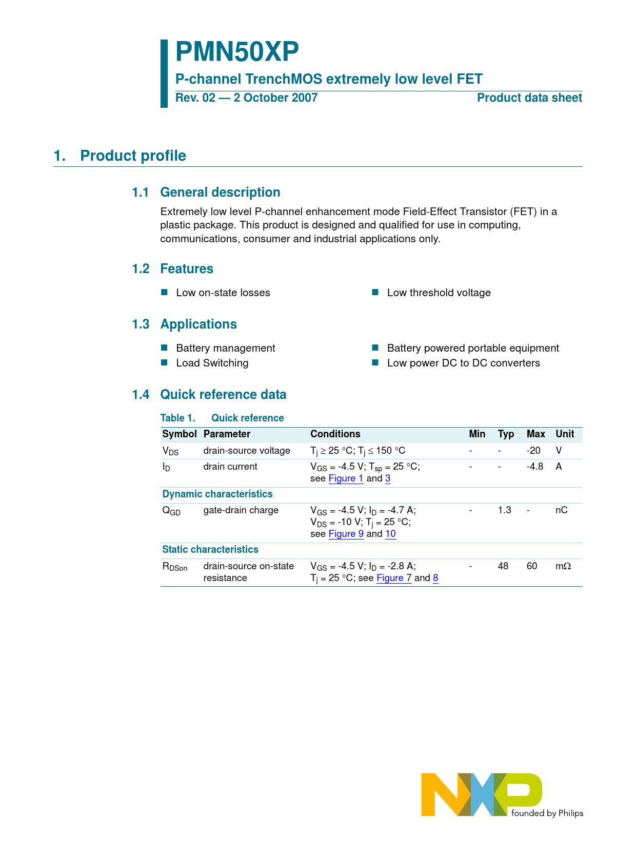 link to page 3 link to page 3 link to page 7 link to page 7 link to page 6 link to page 6 PMN50XP P-channel TrenchMOS extremely low level FETRev. 02 — 2 October 2007Product data sheet1.Product profile1.1 General description Extremely low level P-channel enhancement mode Field-Effect Transistor (FET) in a plastic package. This product is designed and qualified for use in computing, communications, consumer and industrial applications only. 1.2 Features Low on-state losses Low threshold voltage 1.3 Applications Battery management Battery powered portable equipment Load Switching Low power DC to DC converters 1.4 Quick reference dataTable 1.Quick referenceSymbol ParameterConditionsMinTypMaxUnit V ≥ ≤ DS drain-source voltage Tj 25 °C; Tj 150 °C - - -20 V ID drain current VGS = -4.5 V; Tsp = 25 °C; - - -4.8 A see Figure 1 and 3 Dynamic characteristics QGD gate-drain charge VGS = -4.5 V; ID = -4.7 A; - 1.3 - nC VDS = -10 V; Tj = 25 °C; see Figure 9 and 10 Static characteristics RDSon drain-source on-state VGS = -4.5 V; ID = -2.8 A; - 48 60 mΩ resistance Tj = 25 °C; see Figure 7 and 8 Document Outline 1. Product profile 1.1 General description 1.2 Features 1.3 Applications 1.4 Quick reference data 2. Pinning information 3. Ordering information 4. Limiting values 5. Thermal characteristics 6. Characteristics 7. Package outline 8. Revision history 9. Legal information 9.1 Data sheet status 9.2 Definitions 9.3 Disclaimers 9.4 Trademarks 10. Contact information 11. Contents
