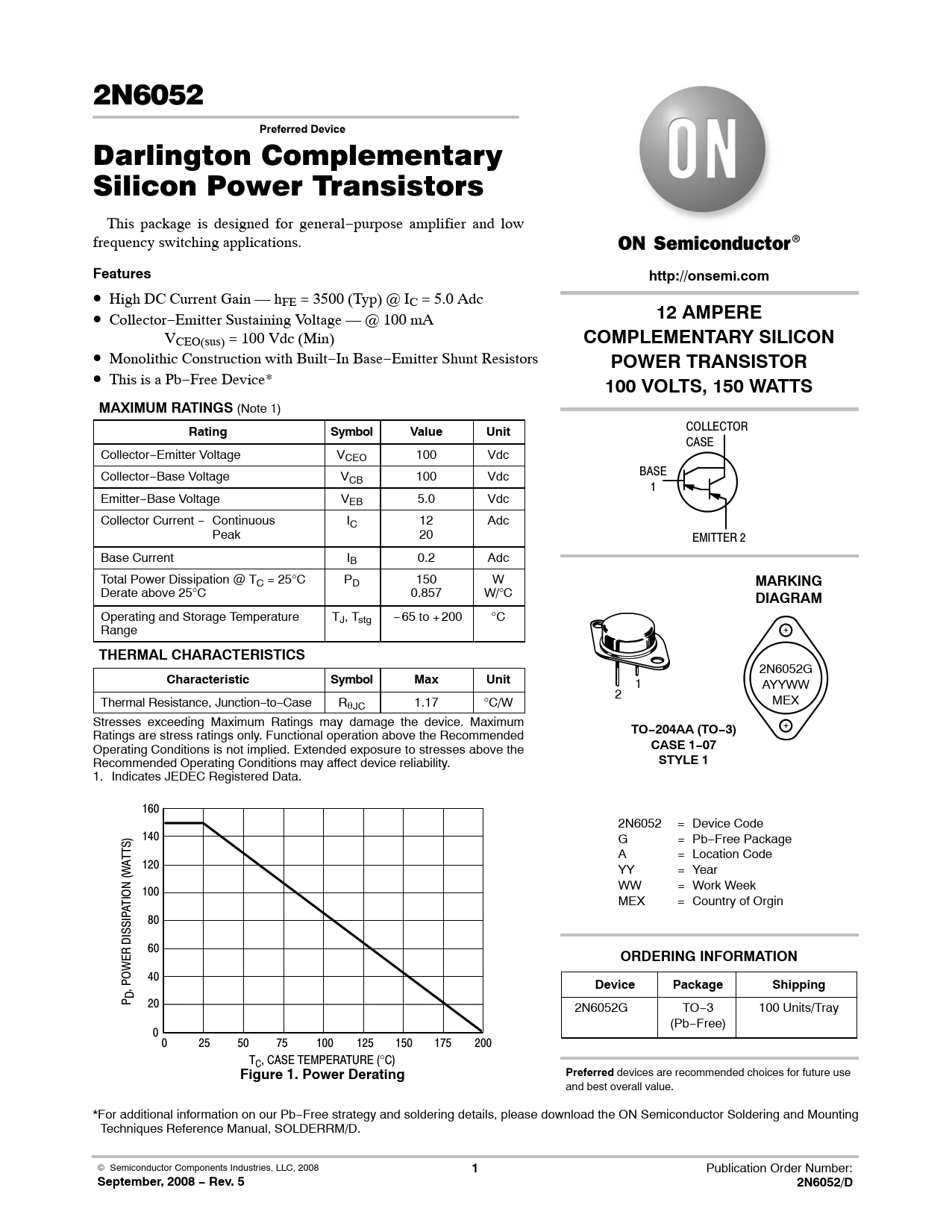 DP 20 2N6052G TO−3 100 Units/Tray (Pb−Free) 0 0 25 50 75 100 125 150 175 200 TC, CASE TEMPERATURE (°C)