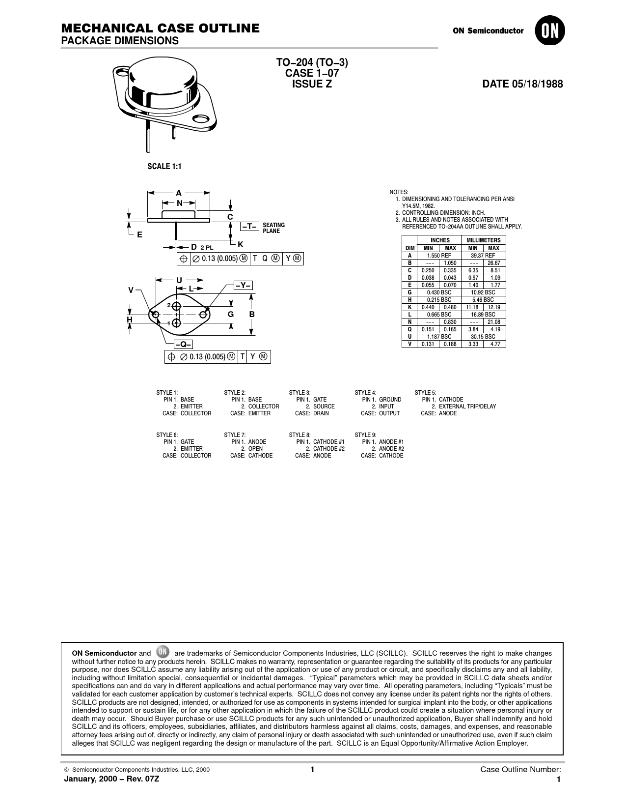 PACKAGE DIMENSIONS TO−204 (TO−3) CASE 1−07 ISSUE Z DATE 05/18/1988 SCALE 1:1