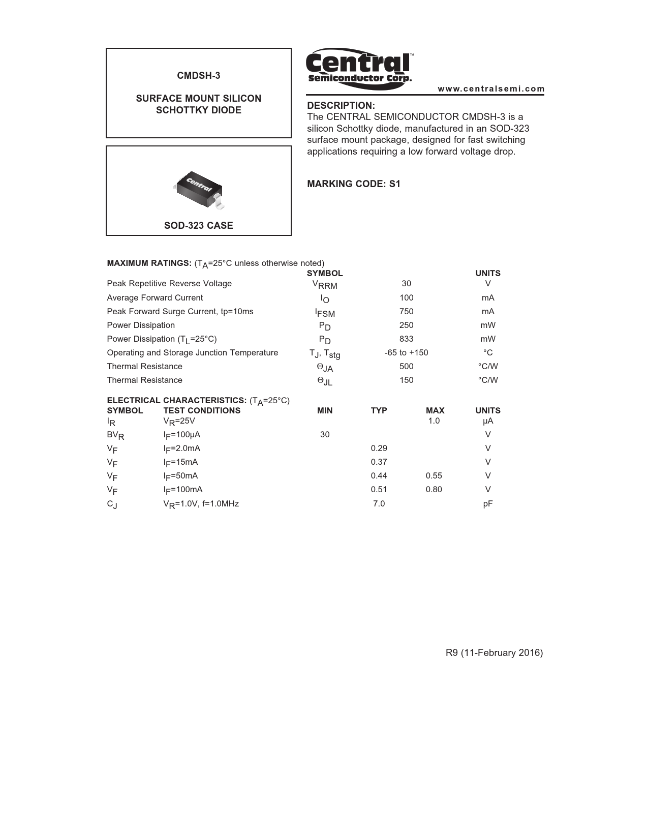 CMDSH-3w w w. c e n t r a l s e m i . c o mSURFACE MOUNT SILICONDESCRIPTION:SCHOTTKY DIODE The CENTRAL SEMICONDUCTOR CMDSH-3 is a silicon Schottky diode, manufactured in an SOD-323 surface mount package, designed for fast switching applications requiring a low forward voltage drop. MARKING CODE: S1SOD-323 CASEMAXIMUM RATINGS: (TA=25°C unless otherwise noted) SYMBOL UNITS Peak Repetitive Reverse Voltage VRRM 30 V Average Forward Current IO 100 mA Peak Forward Surge Current, tp=10ms IFSM 750 mA Power Dissipation PD 250 mW Power Dissipation (TL=25°C) PD 833 mW Operating and Storage Junction Temperature TJ, Tstg -65 to +150 °C Thermal Resistance ΘJA 500 °C/W Thermal Resistance ΘJL 150 °C/W ELECTRICAL CHARACTERISTICS: (TA=25°C) SYMBOLTEST CONDITIONSMINTYPMAXUNITS IR VR=25V 1.0 μA BVR IF=100μA 30 V VF IF=2.0mA 0.29 V VF IF=15mA 0.37 V VF IF=50mA 0.44 0.55 V VF IF=100mA 0.51 0.80 V CJ VR=1.0V, f=1.0MHz 7.0 pF R9 (11-February 2016)