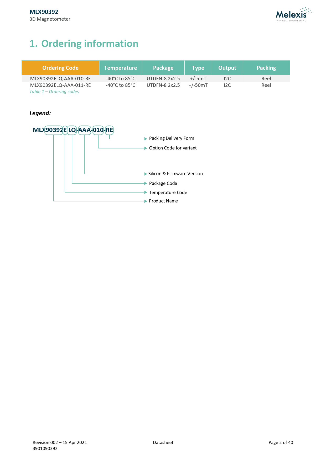 | Pages / Page | 40 / 2 — MLX90392. 1. Ordering information. Ordering Code. Temperature. Package. … |