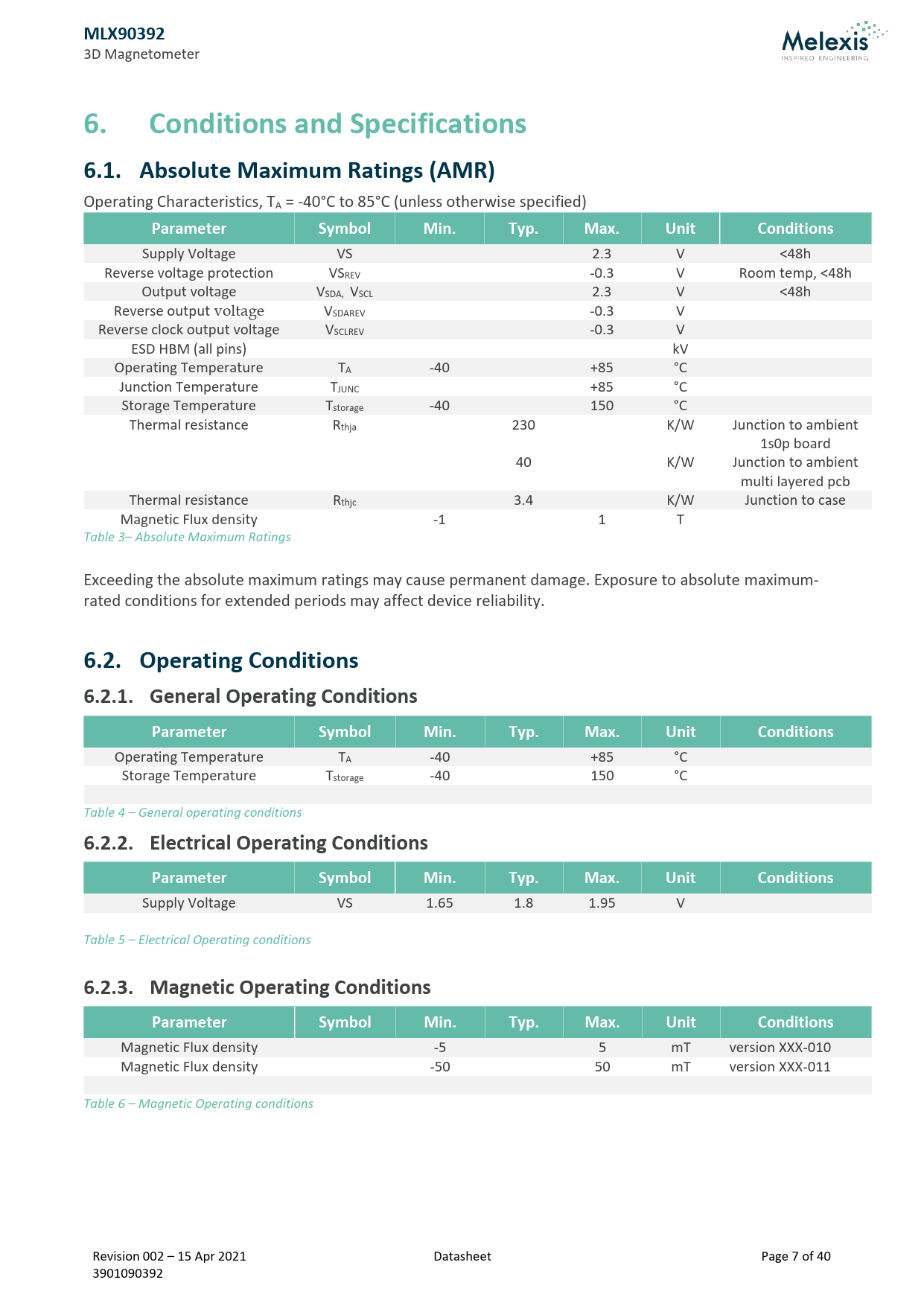 MLX90392. Conditions and Specifications. 6.1. Absolute Maximum Ratings (AMR). Parameter. Symbol. Min. Typ. Max. Unit. Conditions