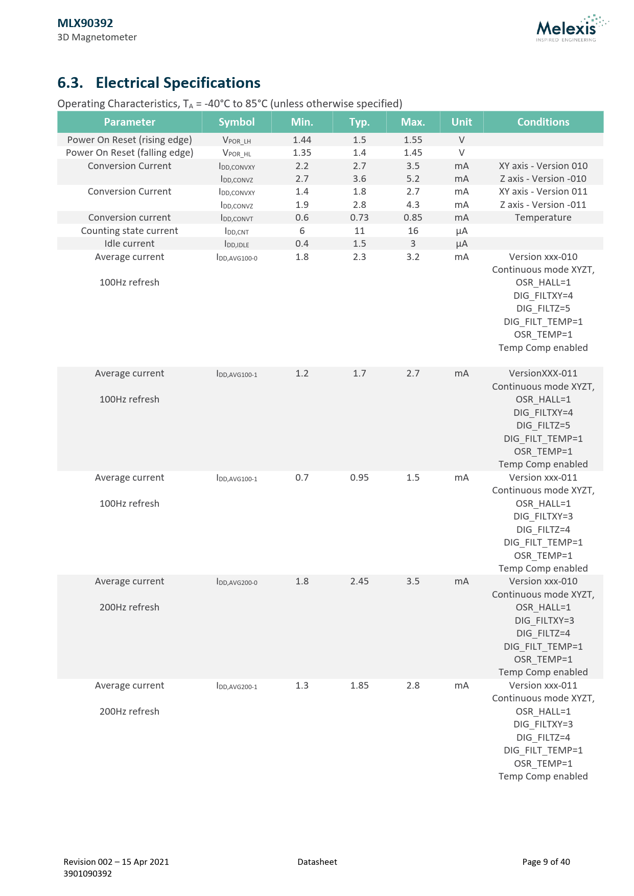 MLX90392. 6.3. Electrical Specifications. Parameter. Symbol. Min. Typ. Max. Unit. Conditions