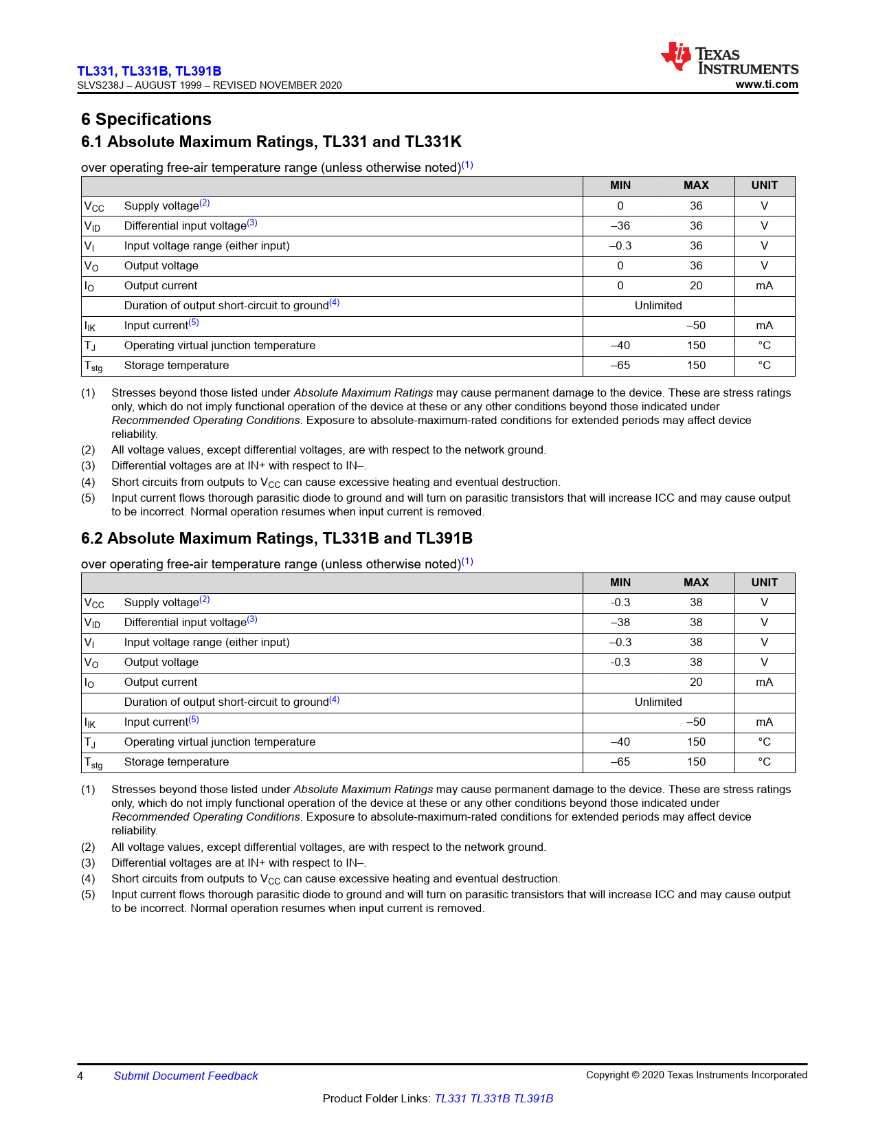 6.2 Absolute Maximum Ratings, TL331B and TL391B