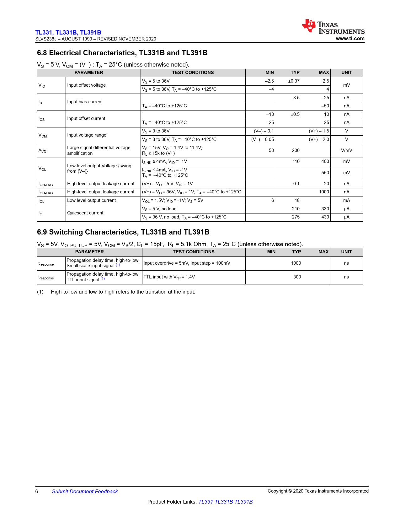 www.ti.com 6.8 Electrical Characteristics, TL331B and TL391B