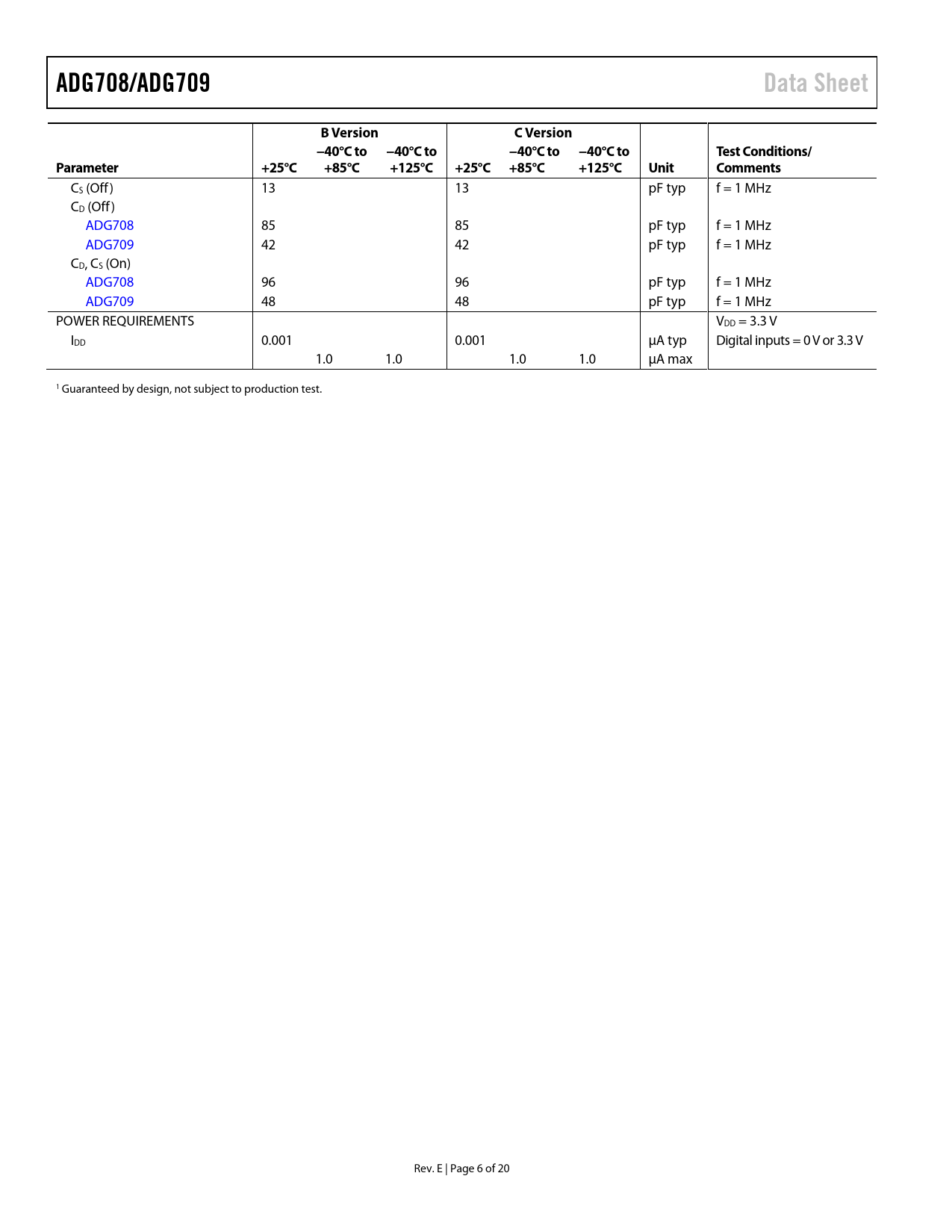 ADG708/ADG709. Data Sheet. B Version. C Version. −40°C to. −40°C to −40°C to. Test Conditions/. Parameter. +25°C. +85°C. +125°C. +25°C +85°C