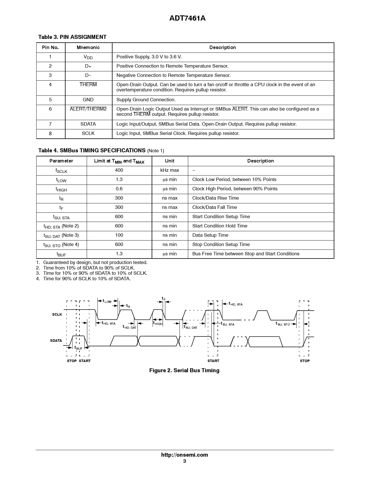 link to page 3 link to page 3 link to page 3 link to page 3 ADT7461ATable 3. PIN ASSIGNMENTPin No.MnemonicDescription 1 VDD Positive Supply, 3.0 V to 3.6 V. 2 D+ Positive Connection to Remote Temperature Sensor. 3 D− Negative Connection to Remote Temperature Sensor. 4 THERM Open-Drain Output. Can be used to turn a fan on/off or throttle a CPU clock in the event of an overtemperature condition. Requires pullup resistor. 5 GND Supply Ground Connection. 6 ALERT/THERM2 Open-Drain Logic Output Used as Interrupt or SMBus ALERT. This can also be configured as a second THERM output. Requires pullup resistor. 7 SDATA Logic Input/Output, SMBus Serial Data. Open-Drain Output. Requires pullup resistor. 8 SCLK Logic Input, SMBus Serial Clock. Requires pullup resistor. Table 4. SMBus TIMING SPECIFICATIONS (Note 1) ParameterLimit at TMIN and TMAXUnitDescription fSCLK 400 kHz max − tLOW 1.3 ms min Clock Low Period, between 10% Points tHIGH 0.6 ms min Clock High Period, between 90% Points tR 300 ns max Clock/Data Rise Time tF 300 ns max Clock/Data Fall Time tSU; STA 600 ns min Start Condition Setup Time tHD; STA (Note 2) 600 ns min Start Condition Hold Time tSU; DAT (Note 3) 100 ns min Data Setup Time tSU; STO (Note 4) 600 ns min Stop Condition Setup Time tBUF 1.3 ms min Bus Free Time between Stop and Start Conditions 1. Guaranteed by design, but not production tested. 2. Time from 10% of SDATA to 90% of SCLK. 3. Time for 10% or 90% of SDATA to 10% of SCLK. 4. Time for 90% of SCLK to 10% of SDATA. tFtLOWttHD; STARSCLKtHD; STAtHIGHtSU; STAtttSU; STOHD; DATSU; DATSDATAtBUFSTOP STARTSTARTSTOPFigure 2. Serial Bus Timinghttp://onsemi.com3