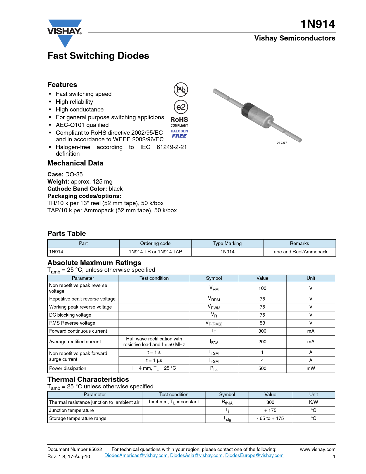 1N914Vishay SemiconductorsFast Switching DiodesFeatures • Fast switching speed • High reliability • High conductance • For general purpose switching applicions • AEC-Q101 qualified • Compliant to RoHS directive 2002/95/EC and in accordance to WEEE 2002/96/EC 94 9367 • Halogen-free according to IEC 61249-2-21 definition Mechanical DataCase: DO-35 Weight: approx. 125 mg Cathode Band Color: black Packaging codes/options: TR/10 k per 13" reel (52 mm tape), 50 k/box TAP/10 k per Ammopack (52 mm tape), 50 k/box Parts Table Part Ordering code Type Marking Remarks 1N914 1N914-TR or 1N914-TAP 1N914 Tape and Reel/Ammopack Absolute Maximum Ratings Tamb = 25 °C, unless otherwise specified Parameter Test condition Symbol Value Unit Non repetitive peak reverse V voltage RM 100 V Repetitive peak reverse voltage VRRM 75 V Working peak reverse voltage VRWM 75 V DC blocking voltage VR 75 V RMS Reverse voltage VR(RMS) 53 V Forward continuous current IF 300 mA Half wave rectification with Average rectified current I resistive load and f > 50 MHz FAV 200 mA Non repetitive peak forward t = 1 s IFSM 1 A surge current t = 1 µs IFSM 4 A Power dissipation I = 4 mm, TL = 25 °C Ptot 500 mW Thermal Characteristics Tamb = 25 °C unless otherwise specified Parameter Test condition Symbol Value Unit Thermal resistance junction to ambient air I = 4 mm, TL = constant RthJA 300 K/W Junction temperature Tj + 175 °C Storage temperature range Tstg - 65 to + 175 °C Document Number 85622 For technical questions within your region, please contact one of the following: www.vishay.com Rev. 1.8, 17-Aug-10 DiodesAmericas@vishay.com, DiodesAsia@vishay.com, DiodesEurope@vishay.com 1 Document Outline Datasheet Disclaimer