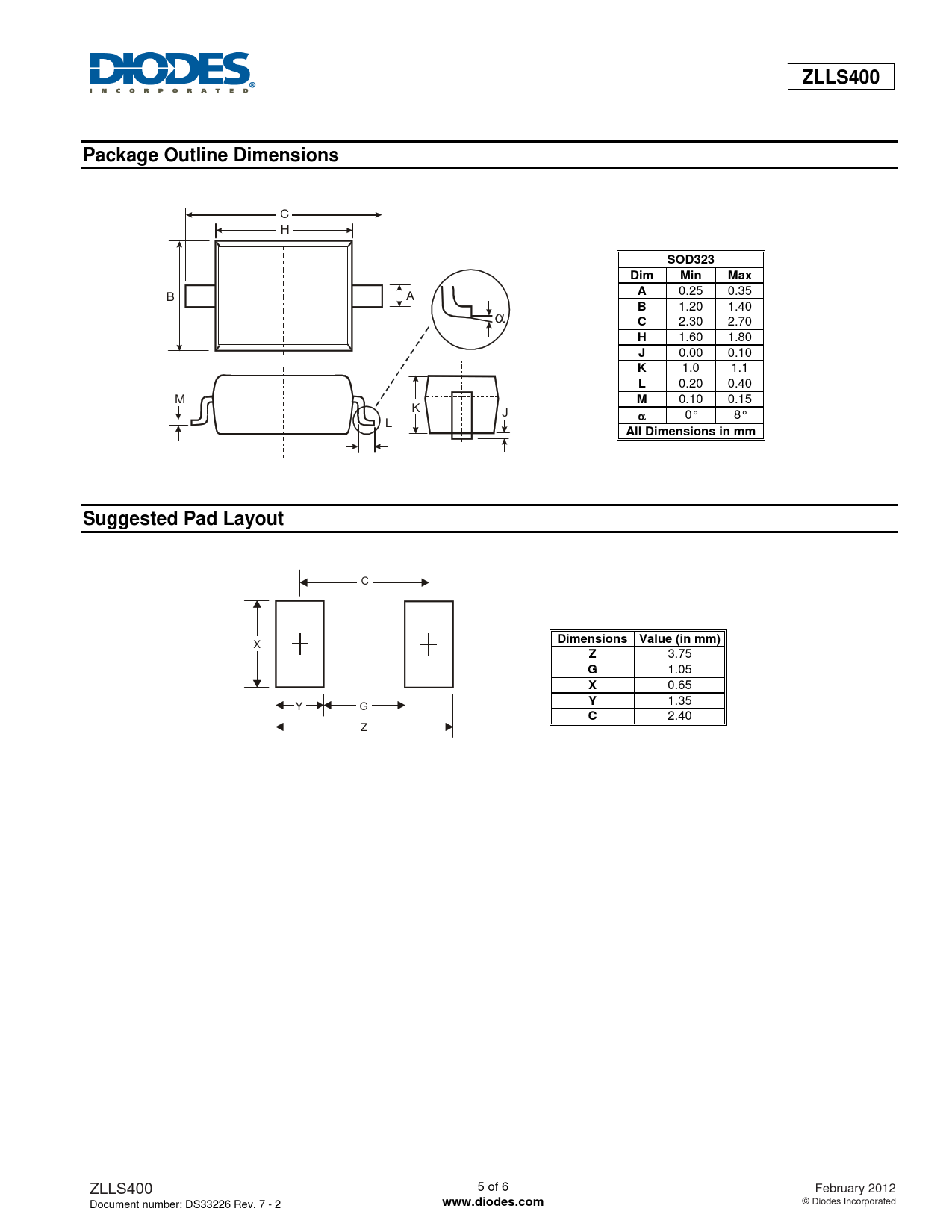 ZLLS400. Package Outline Dimensions. SOD323. Dim Min Max. All Dimensions in mm. Suggested Pad Layout. Dimensions. Value (in mm)