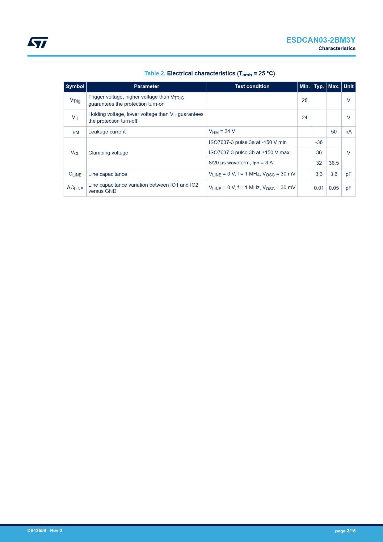 Pages / Page15 / 3 — ESDCAN03-2BM3Y. Characteristics. Table 2. Electrical characteristics …