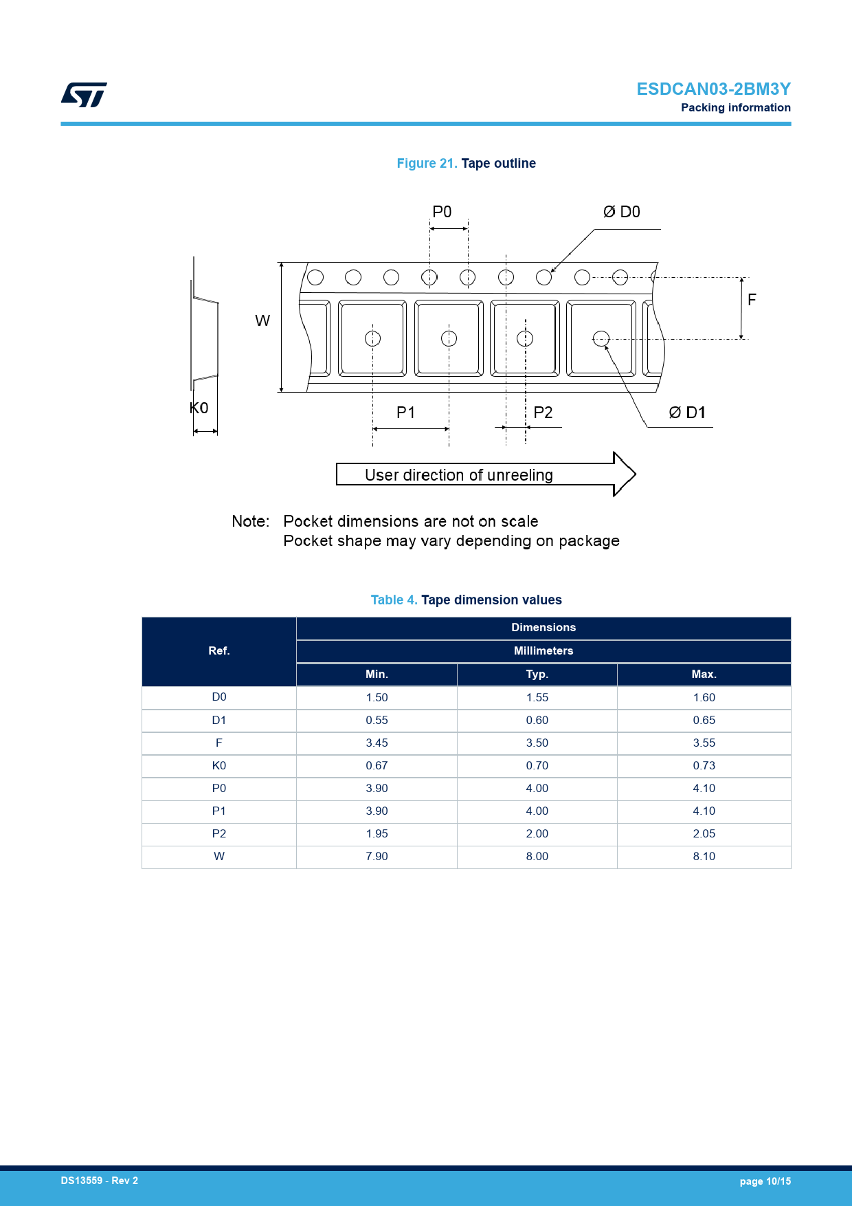 ESDCAN03-2BM3Y. Packing information. Figure 21. Tape outline. Table 4. Tape dimension values. Dimensions. Ref. Millimeters. Min. Typ. Max