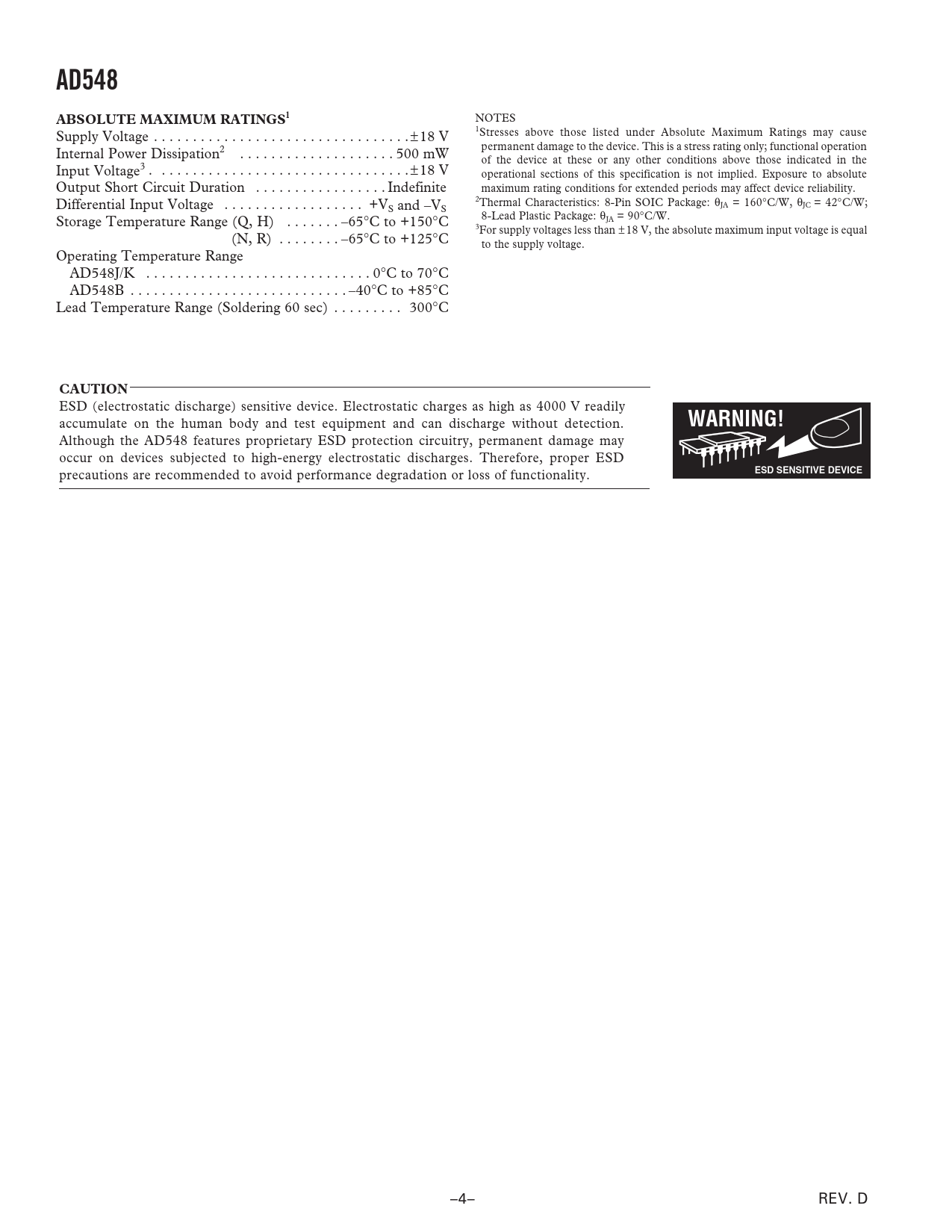 AD548ABSOLUTE MAXIMUM RATINGSl NOTES 1 Supply Voltage . ± 18 V Stresses above those listed under Absolute Maximum Ratings may cause permanent damage to the device. This is a stress rating only; functional operation Internal Power Dissipation2 . 500 mW of the device at these or any other conditions above those indicated in the Input Voltage3 . ± 18 V operational sections of this specification is not implied. Exposure to absolute Output Short Circuit Duration . Indefinite maximum rating conditions for extended periods may affect device reliability. Differential Input Voltage . +V 2Thermal Characteristics: 8-Pin SOIC Package: θ S and –VS JA = 160°C/W, θJC = 42°C/W; Storage Temperature Range (Q, H) . –65°C to +150°C 8-Lead Plastic Package: θJA = 90°C/W. 3For supply voltages less than ±18 V, the absolute maximum input voltage is equal (N, R) . –65°C to +125°C to the supply voltage. Operating Temperature Range AD548J/K . 0°C to 70°C AD548B . –40°C to +85°C Lead Temperature Range (Soldering 60 sec) . 300°C CAUTION ESD (electrostatic discharge) sensitive device. Electrostatic charges as high as 4000 V readily accumulate on the human body and test equipment and can discharge without detection. WARNING! Although the AD548 features proprietary ESD protection circuitry, permanent damage may occur on devices subjected to high-energy electrostatic discharges. Therefore, proper ESD ESD SENSITIVE DEVICE precautions are recommended to avoid performance degradation or loss of functionality. –4– REV. D
