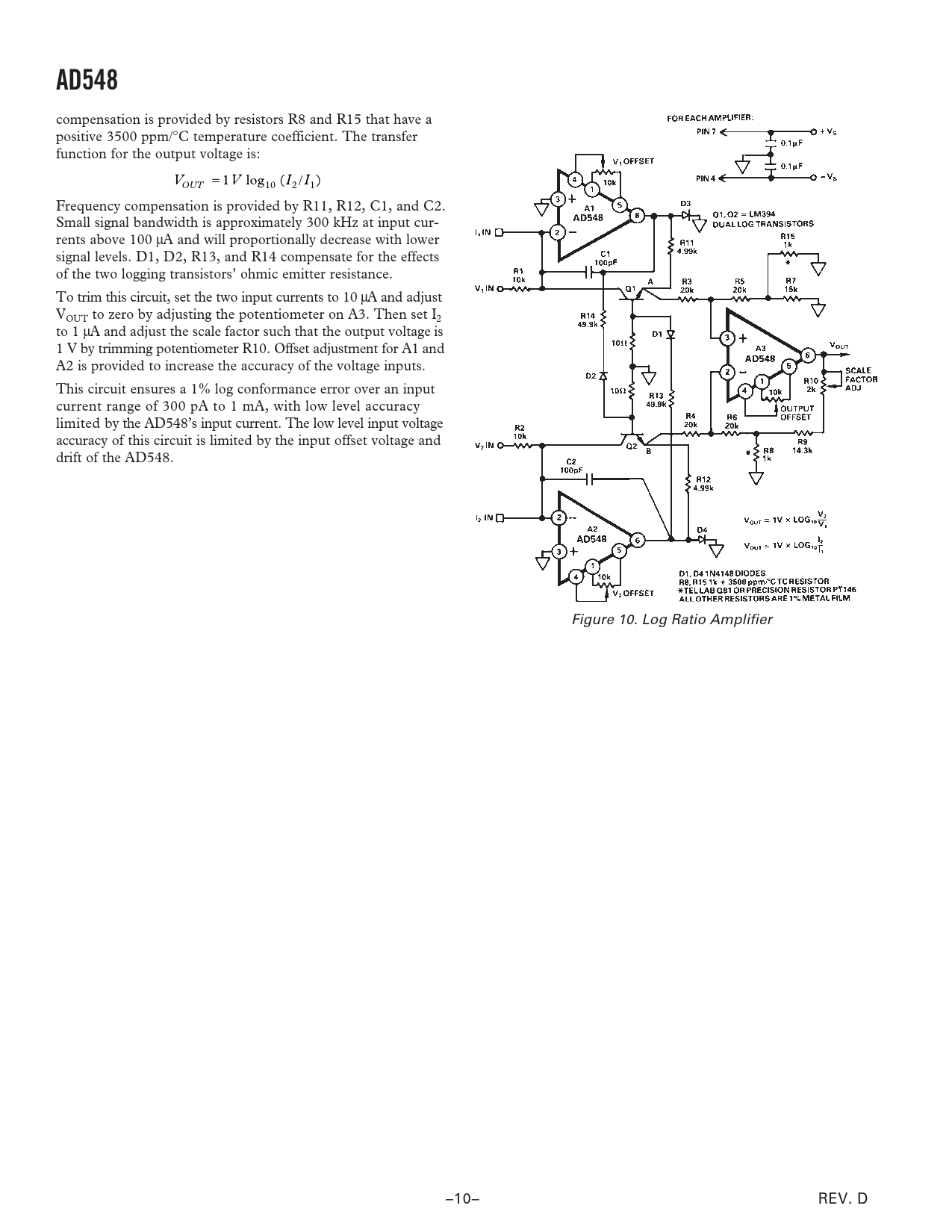 compensation is provided by resistors R8 and R15 that have a positive 3500 ppm/°C temperature coefficient. The transfer function for the output voltage is: V = 1V log (I ) OUT 10 2 / I1 Frequency compensation is provided by R11, R12, C1, and C2. Small signal bandwidth is approximately 300 kHz at input cur- rents above 100 µA and will proportionally decrease with lower signal levels. D1, D2, R13, and R14 compensate for the effects of the two logging transistors’ ohmic emitter resistance. To trim this circuit, set the two input currents to 10 µA and adjust VOUT to zero by adjusting the potentiometer on A3. Then set I2 to 1 µA and adjust the scale factor such that the output voltage is 1 V by trimming potentiometer R10. Offset adjustment for A1 and A2 is provided to increase the accuracy of the voltage inputs. This circuit ensures a 1% log conformance error over an input current range of 300 pA to 1 mA, with low level accuracy limited by the AD548’s input current. The low level input voltage accuracy of this circuit is limited by the input offset voltage and drift of the AD548. Figure 10. Log Ratio Amplifier –10– REV. D