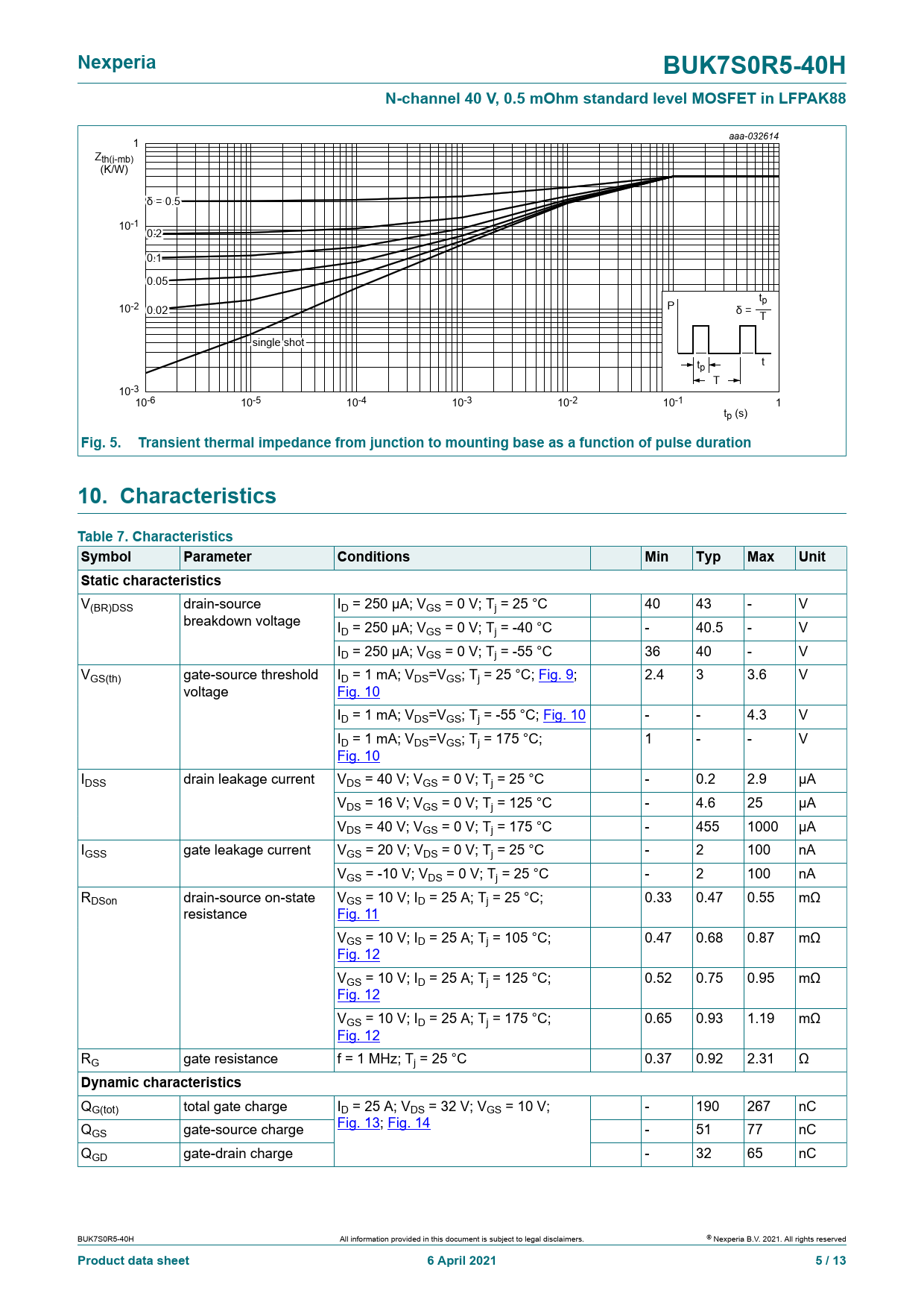 Fig. 5. Transient thermal impedance from junction to mounting base as a function of pulse duration 10. Characteristics Table 7. Characteristics Symbol Parameter Conditions Min Typ Max Unit Static characteristics