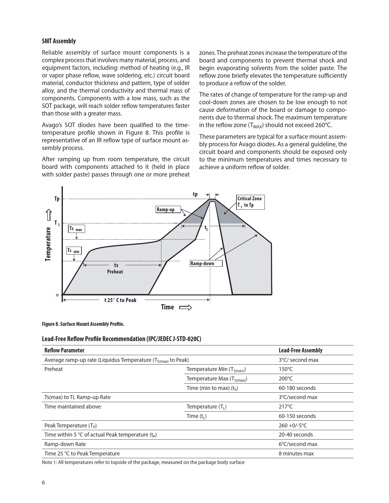 SMT Assembly Reliable assembly of surface mount components is a zones. The preheat zones increase the temperature of the complex process that involves many material, process, and board and components to prevent thermal shock and equipment factors, including: method of heating (e.g., IR begin evaporating solvents from the solder paste. The or vapor phase reflow, wave soldering, etc.) circuit board reflow zone briefly elevates the temperature sufficiently material, conductor thickness and pattern, type of solder to produce a reflow of the solder. alloy, and the thermal conductivity and thermal mass of The rates of change of temperature for the ramp-up and components. Components with a low mass, such as the cool-down zones are chosen to be low enough to not SOT package, will reach solder reflow temperatures faster cause deformation of the board or damage to compo- than those with a greater mass. nents due to thermal shock. The maximum temperature Avago’s SOT diodes have been qualified to the time- in the reflow zone (TMAX) should not exceed 260°C. temperature profile shown in Figure 8. This profile is These parameters are typical for a surface mount assem- representative of an IR reflow type of surface mount as- bly process for Avago diodes. As a general guideline, the sembly process. circuit board and components should be exposed only After ramping up from room temperature, the circuit to the minimum temperatures and times necessary to board with components attached to it (held in place achieve a uniform reflow of solder. with solder paste) passes through one or more preheat tpTpCritical Zone T to TpLRamp-upT LTstmaxLtureTs minTemperatsRamp-downPreheat25t 25 ° C to PeakTimeFigure 8. Surface Mount Assembly Profile.Lead-Free Reflow Profile Recommendation (IPC/JEDEC J-STD-020C)Reflow ParameterLead-Free Assembly Average ramp-up rate (Liquidus Temperature (TS(max) to Peak) 3°C/ second max Preheat Temperature Min (TS(min)) 150°C Temperature Max (TS(max)) 200°C Time (min to max) (tS) 60-180 seconds Ts(max) to TL Ramp-up Rate 3°C/second max Time maintained above: Temperature (TL) 217°C Time (tL) 60-150 seconds Peak Temperature (TP) 260 +0/-5°C Time within 5 °C of actual Peak temperature (tP) 20-40 seconds Ramp-down Rate 6°C/second max Time 25 °C to Peak Temperature 8 minutes max Note 1: All temperatures refer to topside of the package, measured on the package body surface 6