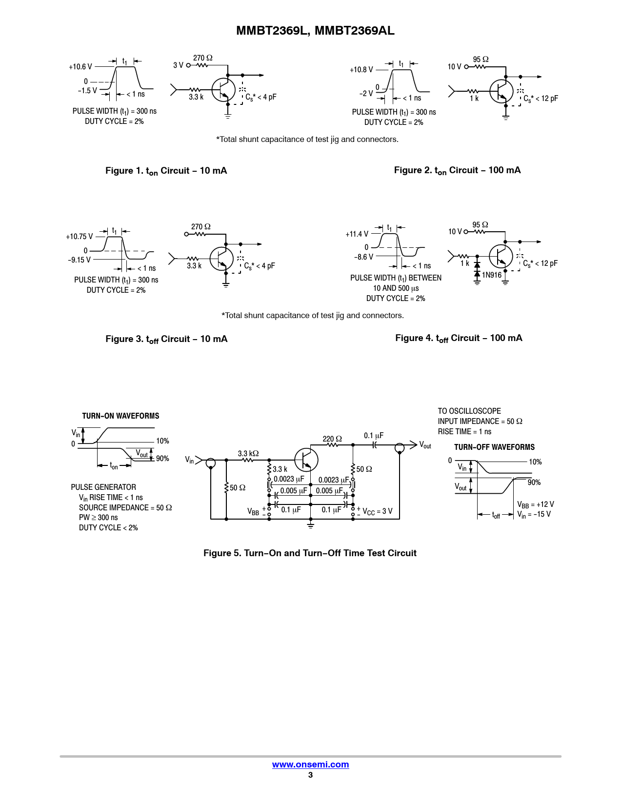 MMBT2369L, MMBT2369AL t 270 W 95 W +10.6 V 1 3 V t1 10 V +10.8 V 0 -1.5 V 0 < 1 ns 3.3 k C -2 V s* < 4 pF < 1 ns 1 k Cs* < 12 pF PULSE WIDTH (t1) = 300 ns PULSE WIDTH (t1) = 300 ns DUTY CYCLE = 2% DUTY CYCLE = 2% *Total shunt capacitance of test jig and connectors. Figure 1. ton Circuit − 10 mAFigure 2. ton Circuit − 100 mA 95 W t 270 W t 1 1 10 V +10.75 V +11.4 V 0 0 -9.15 V -8.6 V 1 k C < 1 ns 3.3 k C < 1 ns s* < 4 pF s* < 12 pF 1N916 PULSE WIDTH (t PULSE WIDTH (t 1) = 300 ns 1) BETWEEN DUTY CYCLE = 2% 10 AND 500 ms DUTY CYCLE = 2% *Total shunt capacitance of test jig and connectors. Figure 3. toff Circuit − 10 mAFigure 4. toff Circuit − 100 mA TO OSCILLOSCOPE TURN-ON WAVEFORMS INPUT IMPEDANCE = 50 W V RISE TIME = 1 ns in 0.1 mF 10% 220 W 0 Vout TURN-OFF WAVEFORMS Vout 3.3 kW 90% V 0 t in 10% on 3.3 k 50 W Vin 0.0023 mF 0.0023 mF 90% PULSE GENERATOR 50 W V 0.005 mF 0.005 mF out Vin RISE TIME < 1 ns VBB = +12 V SOURCE IMPEDANCE = 50 W V + 0.1 mF 0.1 mF + BB - - VCC = 3 V toff Vin = -15 V PW ≥ 300 ns DUTY CYCLE < 2% Figure 5. Turn−On and Turn−Off Time Test Circuitwww.onsemi.com3