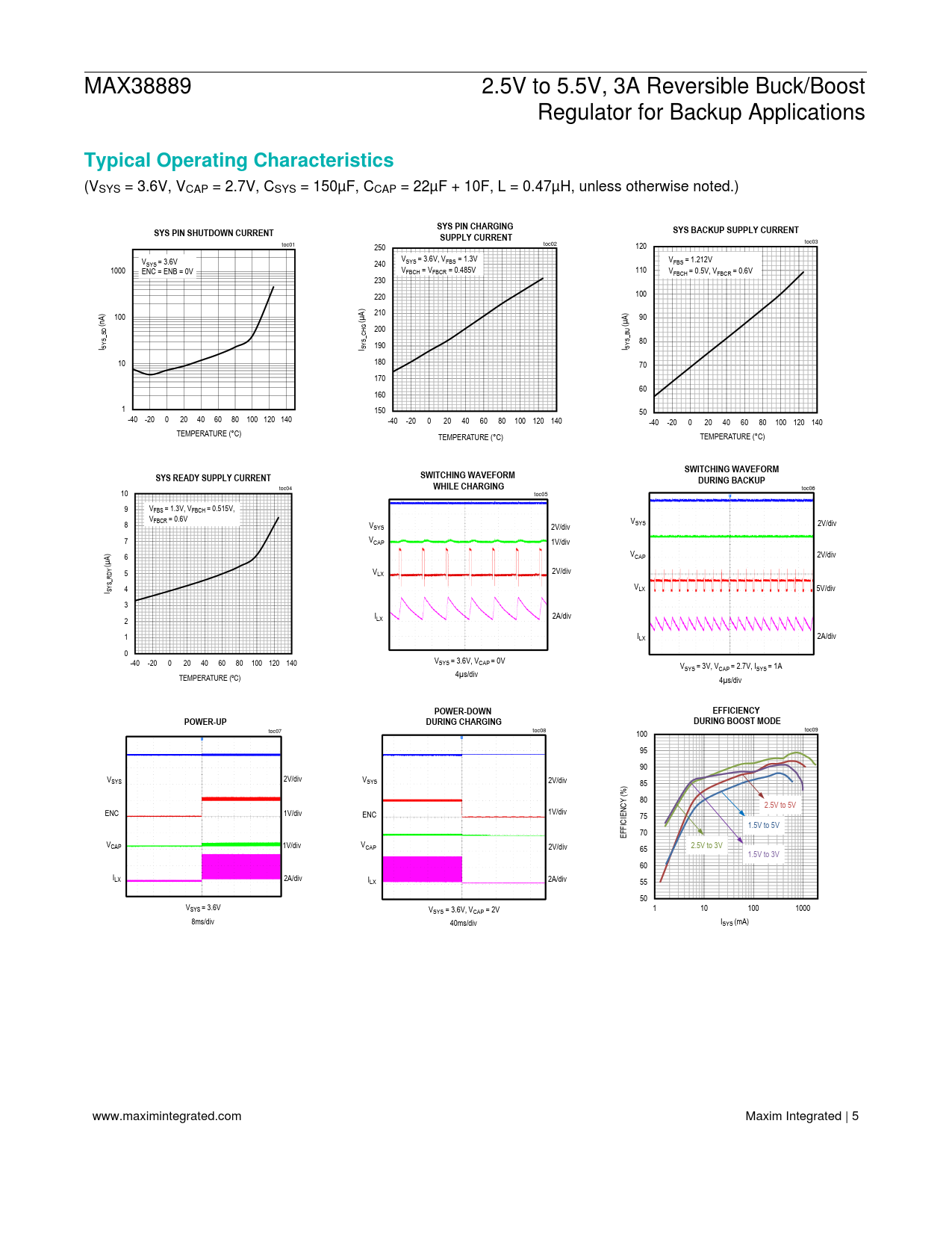 toc06 10 toc04 toc05 9 VFBS = 1.3V, VFBCH = 0.515V, V 8 FBCR = 0.6V V VSYS 2V/div SYS 2V/div 7 VCAP 1V/div ) 6 VCAP 2V/div (µA Y 5 V 2V/div RD LX _SY 4 V I S LX 5V/div 3 I 2A/div 2 LX 1 ILX 2A/div 0 -40 -20 0 20 40 60 80 100 120 140 VSYS = 3.6V, VCAP = 0V VSYS = 3V, VCAP = 2.7V, ISYS = 1A TEMPERATURE (ºC) 4µs/div 4µs/div