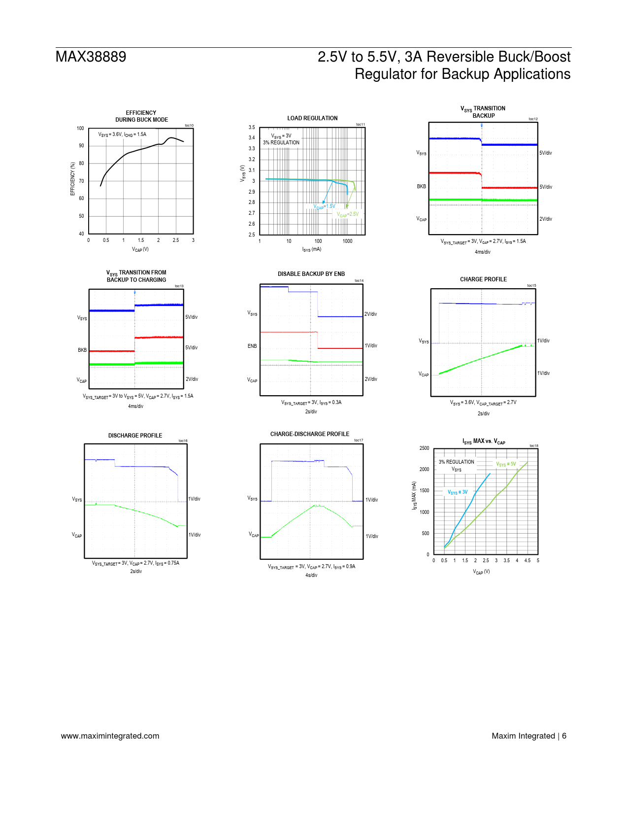 toc14 toc13 toc15 VSYS 2V/div V 5V/div SYS VSYS 1V/div ENB 1V/div BKB 5V/div VCAP 1V/div V 2V/div CAP 2V/div VCAP VSYS_TARGET = 3V to VSYS = 5V, VCAP = 2.7V, ISYS = 1.5A V V 4ms/div SYS_TARGET = 3V, ISYS = 0.3A SYS = 3.6V, VCAP_TARGET = 2.7V 2s/div 2s/div