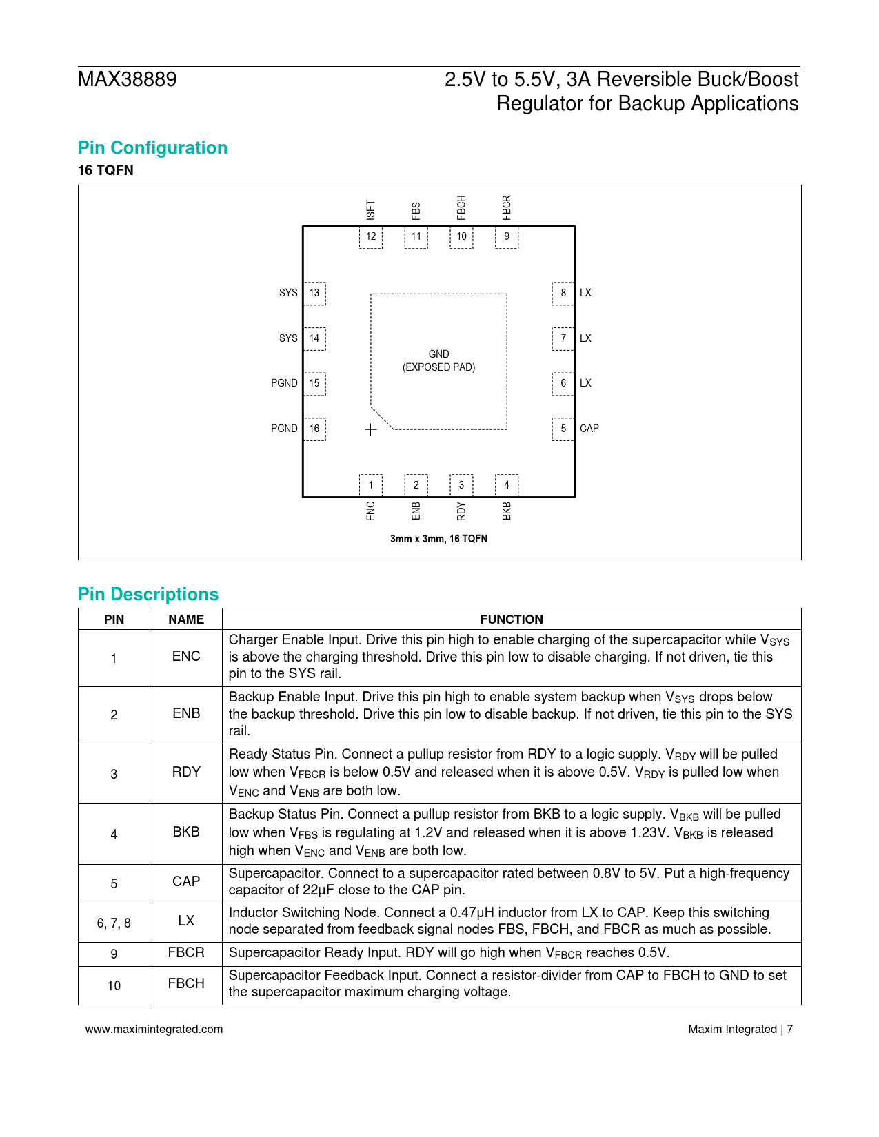 Pin Configuration 16 TQFN. 3mm x 3mm, 16 TQFN. Pin Descriptions. PIN. NAME. FUNCTION