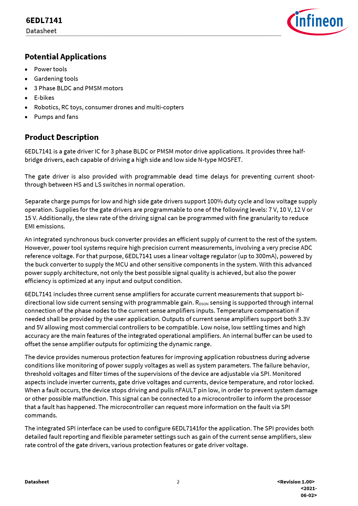 6EDL7141. Potential Applications. Product Description. Datasheet. <Revision 1.00>. <2021- 06-02>