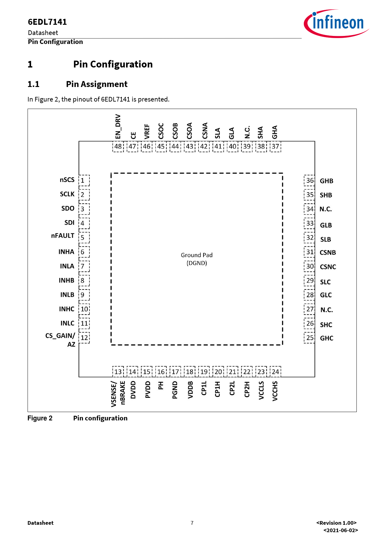 link to page 7 6EDL7141 Datasheet Pin Configuration1Pin Configuration1.1Pin Assignment In Figure 2, the pinout of 6EDL7141 is presented. Figure 2Pin configurationDatasheet 7 <Revision 1.00><2021-06-02> Document Outline Product Feature Summary Potential Applications Product Description System Block Diagram Package Description 1 Pin Configuration 1.1 Pin Assignment 1.2 Pin Definitions and Functions 2 General Product Characteristics 2.1 Absolute Maximum Ratings 2.2 Recommended Operating Conditions 2.3 ESD Robustness 2.4 Thermal Resistance 2.5 Electrical Characteristics 2.6 Electrical Characteristic Graphs 3 Product Features 3.1 Functional Block Diagram 3.2 PWM Modes 3.2.1 PWM with 6 Independent Inputs – 6PWM 3.2.2 PWM with 3 Independent Inputs – 3PWM 3.2.3 PWM with 1 Input and Commutation Pattern – 1PWM 3.2.4 PWM with 1 Input and Commutation with Hall Sensor Inputs – 1PWM with Hall Sensors 3.2.5 PWM with 1 Input and Commutation with Hall Sensor Inputs and Alternating Recirculation – 1PWM with Hall Sensors and Alternating Recirculation 3.2.6 PWM Braking Modes 3.2.7 Dead Time Insertion 3.3 Integrated Three Phase Gate Driver 3.3.1 Gate Driver Architecture 3.3.2 Slew Rate Control 3.3.2.1 Slew Rate Control Parameters and Usage 3.3.3 Gate Driver Voltage Programmability 3.4 Charge Pump Configuration 3.4.1 Charge Pump Clock Frequency Selection 3.4.2 Charge Pump Clock Spread Spectrum Feature 3.4.3 Charge Pump Pre-Charge for VCCLS 3.4.4 Charge Pump Tuning 3.4.5 Gate Driver and Charge Pumps Protections 3.4.5.1 VCCLS Under-Voltage Lock-Out (VCCLS UVLO) 3.4.5.2 VCCHS Under-Voltage Lock-Out (VCCLS UVLO) 3.4.5.3 Floating Gate Strong Pull Down 3.5 Power Supply System 3.5.1 Synchronous Buck Converter Description 3.5.1.1 Buck Converter Output Voltage Dependency on PVCC_SETPT 3.5.1.2 Synchronous Buck Converter Protections 3.5.2 DVDD Linear Regulator 3.5.2.1 DVDD Linear Regulator OCP 3.6 Current Sense Amplifiers 3.6.1 RDSON Sensing Mode vs Leg Shunt Mode 3.6.2 Current Shunt Amplifier Timing Mode 3.6.3 Current Shunt Amplifier Blanking Time 3.6.4 Current Sense Amplifier Offset Generation: Internal or External (VREF pin) 3.6.5 Overcurrent Comparators and DAC for Current Sense Amplifiers 3.6.5.1 OCP Use Cases 3.6.5.2 OCP Fault Reporting 3.6.5.3 OCP Fault Latching 3.6.5.4 PWM Truncation 3.6.6 Current Sense Amplifier Gain Selection 3.6.7 Current Sense Amplifier DC Calibration 3.6.8 Auto-Zero Compensation of Current Sense Amplifier 3.6.8.1 Internal Auto-Zero 3.6.8.2 External Auto-Zero Synchronization via CS_GAIN/AZ Pin 3.6.8.3 External Auto-Zero Synchronization via CS_GAIN/AZ Pin with Enhanced Sensing 3.7 Hall Comparators 3.8 Watchdog Timers 3.8.1 Buck converter watchdog 3.8.2 General Purpose Watchdog 3.8.3 Locked-Rotor Protection Watchdog Timer 3.9 Multi-Function Pins 3.9.1 EN_DRV Pin 3.9.2 VSENSE/nBRAKE Pin 3.9.3 CS_GAIN/AZ Pin 3.10 ADC Module-Analog to Digital Converter 3.10.1 ADC Measurement Sequencing and On Demand Conversion 3.10.2 Die Temperature Sensor 4 Device Start-Up 4.1 Power Supply Start-Up 4.2 Gate Driver and CSAMP Start-up 5 Device Functional States 6 Protections and Faults Handling 7 Device Programming-OTP and SPI interface 7.1.1 OTP User Programming Procedure: Loading Custom Default Values 7.1.2 SPI Communication 7.1.2.1 SPI Communication Example 8 Register Map 8.1 Device Programmability 8.2 Register Map Faults Status Register Temperature Status Register Power Supply Status Register Functional Status Register OTP Status Register ADC Status Register Charge Pumps Status Register Device ID Register Faults Clear Register Power Supply Configuration Register ADC Configuration Register PWM Configuration Register Sensor Configuration Register Watchdog Configuration Register Watchdog Configuration Register 2 Gate Driver Current Control Register Gate Driver Pre-Charge Current Control Register TDRIVE Source Control Register TDRIVE Sink Control Register Dead Time Register Charge Pump Configuration Register Current Sense Amplifier Configuration Register Current Sense Amplifier Configuration Register 2 OTP Program Register 9 Application Description 9.1 Recommended External Components 9.2 PCB Layout Recommendations 9.3 Typical Applications 10 ESD Protection 11 Package Information Revision history