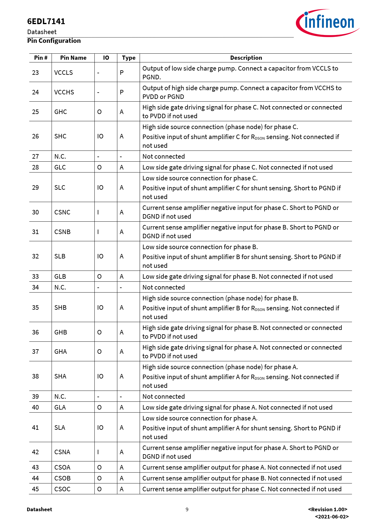 6EDL7141 Datasheet Pin ConfigurationPin #Pin NameIOTypeDescription Output of low side charge pump. Connect a capacitor from VCCLS to 23 VCCLS - P PGND. Output of high side charge pump. Connect a capacitor from VCCHS to 24 VCCHS - P PVDD or PGND High side gate driving signal for phase C. Not connected or connected 25 GHC O A to PVDD if not used High side source connection (phase node) for phase C. 26 SHC IO A Positive input of shunt amplifier C for RDSON sensing. Not connected if not used 27 N.C. - - Not connected 28 GLC O A Low side gate driving signal for phase C. Not connected if not used Low side source connection for phase C. 29 SLC IO A Positive input of shunt amplifier C for shunt sensing. Short to PGND if not used Current sense amplifier negative input for phase C. Short to PGND or 30 CSNC I A DGND if not used Current sense amplifier negative input for phase B. Short to PGND or 31 CSNB I A DGND if not used Low side source connection for phase B. 32 SLB IO A Positive input of shunt amplifier B for shunt sensing. Short to PGND if not used 33 GLB O A Low side gate driving signal for phase B. Not connected if not used 34 N.C. - - Not connected High side source connection (phase node) for phase B. 35 SHB IO A Positive input of shunt amplifier B for RDSON sensing. Not connected if not used High side gate driving signal for phase B. Not connected or connected 36 GHB O A to PVDD if not used High side gate driving signal for phase A. Not connected or connected 37 GHA O A to PVDD if not used High side source connection (phase node) for phase A. 38 SHA IO A Positive input of shunt amplifier A for RDSON sensing. Not connected if not used 39 N.C. - - Not connected 40 GLA O A Low side gate driving signal for phase A. Not connected if not used Low side source connection for phase A. 41 SLA IO A Positive input of shunt amplifier A for shunt sensing. Short to PGND if not used Current sense amplifier negative input for phase A. Short to PGND or 42 CSNA I A DGND if not used 43 CSOA O A Current sense amplifier output for phase A. Not connected if not used 44 CSOB O A Current sense amplifier output for phase B. Not connected if not used 45 CSOC O A Current sense amplifier output for phase C. Not connected if not used Datasheet 9 <Revision 1.00><2021-06-02> Document Outline Product Feature Summary Potential Applications Product Description System Block Diagram Package Description 1 Pin Configuration 1.1 Pin Assignment 1.2 Pin Definitions and Functions 2 General Product Characteristics 2.1 Absolute Maximum Ratings 2.2 Recommended Operating Conditions 2.3 ESD Robustness 2.4 Thermal Resistance 2.5 Electrical Characteristics 2.6 Electrical Characteristic Graphs 3 Product Features 3.1 Functional Block Diagram 3.2 PWM Modes 3.2.1 PWM with 6 Independent Inputs – 6PWM 3.2.2 PWM with 3 Independent Inputs – 3PWM 3.2.3 PWM with 1 Input and Commutation Pattern – 1PWM 3.2.4 PWM with 1 Input and Commutation with Hall Sensor Inputs – 1PWM with Hall Sensors 3.2.5 PWM with 1 Input and Commutation with Hall Sensor Inputs and Alternating Recirculation – 1PWM with Hall Sensors and Alternating Recirculation 3.2.6 PWM Braking Modes 3.2.7 Dead Time Insertion 3.3 Integrated Three Phase Gate Driver 3.3.1 Gate Driver Architecture 3.3.2 Slew Rate Control 3.3.2.1 Slew Rate Control Parameters and Usage 3.3.3 Gate Driver Voltage Programmability 3.4 Charge Pump Configuration 3.4.1 Charge Pump Clock Frequency Selection 3.4.2 Charge Pump Clock Spread Spectrum Feature 3.4.3 Charge Pump Pre-Charge for VCCLS 3.4.4 Charge Pump Tuning 3.4.5 Gate Driver and Charge Pumps Protections 3.4.5.1 VCCLS Under-Voltage Lock-Out (VCCLS UVLO) 3.4.5.2 VCCHS Under-Voltage Lock-Out (VCCLS UVLO) 3.4.5.3 Floating Gate Strong Pull Down 3.5 Power Supply System 3.5.1 Synchronous Buck Converter Description 3.5.1.1 Buck Converter Output Voltage Dependency on PVCC_SETPT 3.5.1.2 Synchronous Buck Converter Protections 3.5.2 DVDD Linear Regulator 3.5.2.1 DVDD Linear Regulator OCP 3.6 Current Sense Amplifiers 3.6.1 RDSON Sensing Mode vs Leg Shunt Mode 3.6.2 Current Shunt Amplifier Timing Mode 3.6.3 Current Shunt Amplifier Blanking Time 3.6.4 Current Sense Amplifier Offset Generation: Internal or External (VREF pin) 3.6.5 Overcurrent Comparators and DAC for Current Sense Amplifiers 3.6.5.1 OCP Use Cases 3.6.5.2 OCP Fault Reporting 3.6.5.3 OCP Fault Latching 3.6.5.4 PWM Truncation 3.6.6 Current Sense Amplifier Gain Selection 3.6.7 Current Sense Amplifier DC Calibration 3.6.8 Auto-Zero Compensation of Current Sense Amplifier 3.6.8.1 Internal Auto-Zero 3.6.8.2 External Auto-Zero Synchronization via CS_GAIN/AZ Pin 3.6.8.3 External Auto-Zero Synchronization via CS_GAIN/AZ Pin with Enhanced Sensing 3.7 Hall Comparators 3.8 Watchdog Timers 3.8.1 Buck converter watchdog 3.8.2 General Purpose Watchdog 3.8.3 Locked-Rotor Protection Watchdog Timer 3.9 Multi-Function Pins 3.9.1 EN_DRV Pin 3.9.2 VSENSE/nBRAKE Pin 3.9.3 CS_GAIN/AZ Pin 3.10 ADC Module-Analog to Digital Converter 3.10.1 ADC Measurement Sequencing and On Demand Conversion 3.10.2 Die Temperature Sensor 4 Device Start-Up 4.1 Power Supply Start-Up 4.2 Gate Driver and CSAMP Start-up 5 Device Functional States 6 Protections and Faults Handling 7 Device Programming-OTP and SPI interface 7.1.1 OTP User Programming Procedure: Loading Custom Default Values 7.1.2 SPI Communication 7.1.2.1 SPI Communication Example 8 Register Map 8.1 Device Programmability 8.2 Register Map Faults Status Register Temperature Status Register Power Supply Status Register Functional Status Register OTP Status Register ADC Status Register Charge Pumps Status Register Device ID Register Faults Clear Register Power Supply Configuration Register ADC Configuration Register PWM Configuration Register Sensor Configuration Register Watchdog Configuration Register Watchdog Configuration Register 2 Gate Driver Current Control Register Gate Driver Pre-Charge Current Control Register TDRIVE Source Control Register TDRIVE Sink Control Register Dead Tim