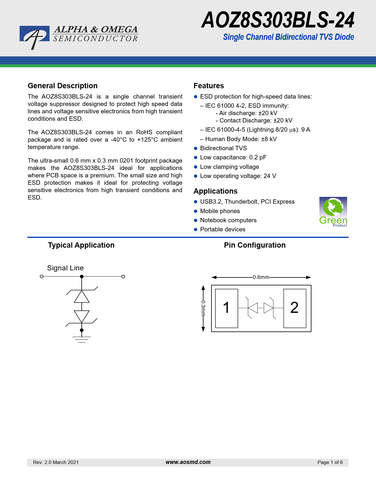 AOZ8S303BLS-24Single Channel Bidirectional TVS DiodeGeneral DescriptionFeatures The AOZ8S303BLS-24 is a single channel transient ESD protection for high-speed data lines: voltage suppressor designed to protect high speed data – IEC 61000 4-2, ESD immunity: lines and voltage sensitive electronics from high transient - Air discharge: ±20 kV conditions and ESD. - Contact Discharge: ±20 kV The AOZ8S303BLS-24 comes in an RoHS compliant – IEC 61000-4-5 (Lightning 8/20 s): 9 A package and is rated over a -40°C to +125°C ambient – Human Body Mode: ±8 kV temperature range. Bidirectional TVS The ultra-small 0.6 mm x 0.3 mm 0201 footprint package Low capacitance: 0.2 pF makes the AOZ8S303BLS-24 ideal for applications Low clamping voltage where PCB space is a premium. The small size and high Low operating voltage: 24 V ESD protection makes it ideal for protecting voltage sensitive electronics from high transient conditions and Applications ESD. USB3.2, Thunderbolt, PCI Express Mobile phones Notebook computers Portable devices Typical ApplicationPin Configuration Signal Line 0.6mm 0.3m m 1 2 Rev. 2.0 March 2021 www.aosmd.com Page 1 of 6