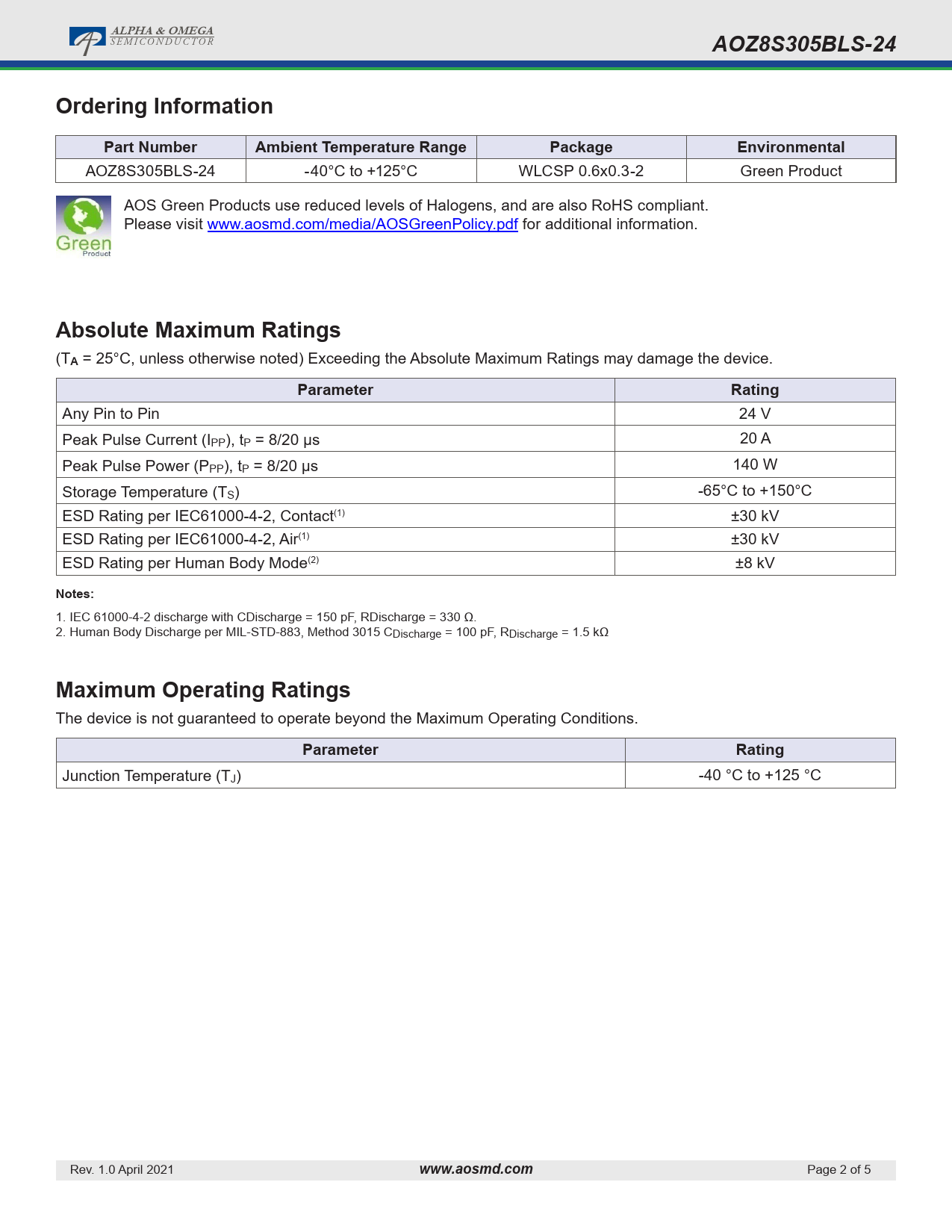ALPHA & OMEGA S E M I C O N D U C T O R AOZ8S305BLS-24Ordering InformationPart NumberAmbient Temperature RangePackageEnvironmental AOZ8S305BLS-24 -40°C to +125°C WLCSP 0.6x0.3-2 Green Product AOS Green Products use reduced levels of Halogens, and are also RoHS compliant. Please visit www.aosmd.com/media/AOSGreenPolicy.pdf for additional information. Absolute Maximum Ratings (T A = 25°C, unless otherwise noted) Exceeding the Absolute Maximum Ratings may damage the device. ParameterRating Any Pin to Pin 24 V Peak Pulse Current (IPP), tP = 8/20 µs 20 A Peak Pulse Power (PPP), tP = 8/20 µs 140 W Storage Temperature (TS) -65°C to +150°C ESD Rating per IEC61000-4-2, Contact(1) ±30 kV ESD Rating per IEC61000-4-2, Air(1) ±30 kV ESD Rating per Human Body Mode(2) ±8 kV Notes: 1. IEC 61000-4-2 discharge with CDischarge = 150 pF, RDischarge = 330 Ω. 2. Human Body Discharge per MIL-STD-883, Method 3015 CDischarge = 100 pF, RDischarge = 1.5 kΩ Maximum Operating Ratings The device is not guaranteed to operate beyond the Maximum Operating Conditions. ParameterRating Junction Temperature (TJ) -40 °C to +125 °C Rev. 1.0 April 2021 www.aosmd.com Page 2 of 5