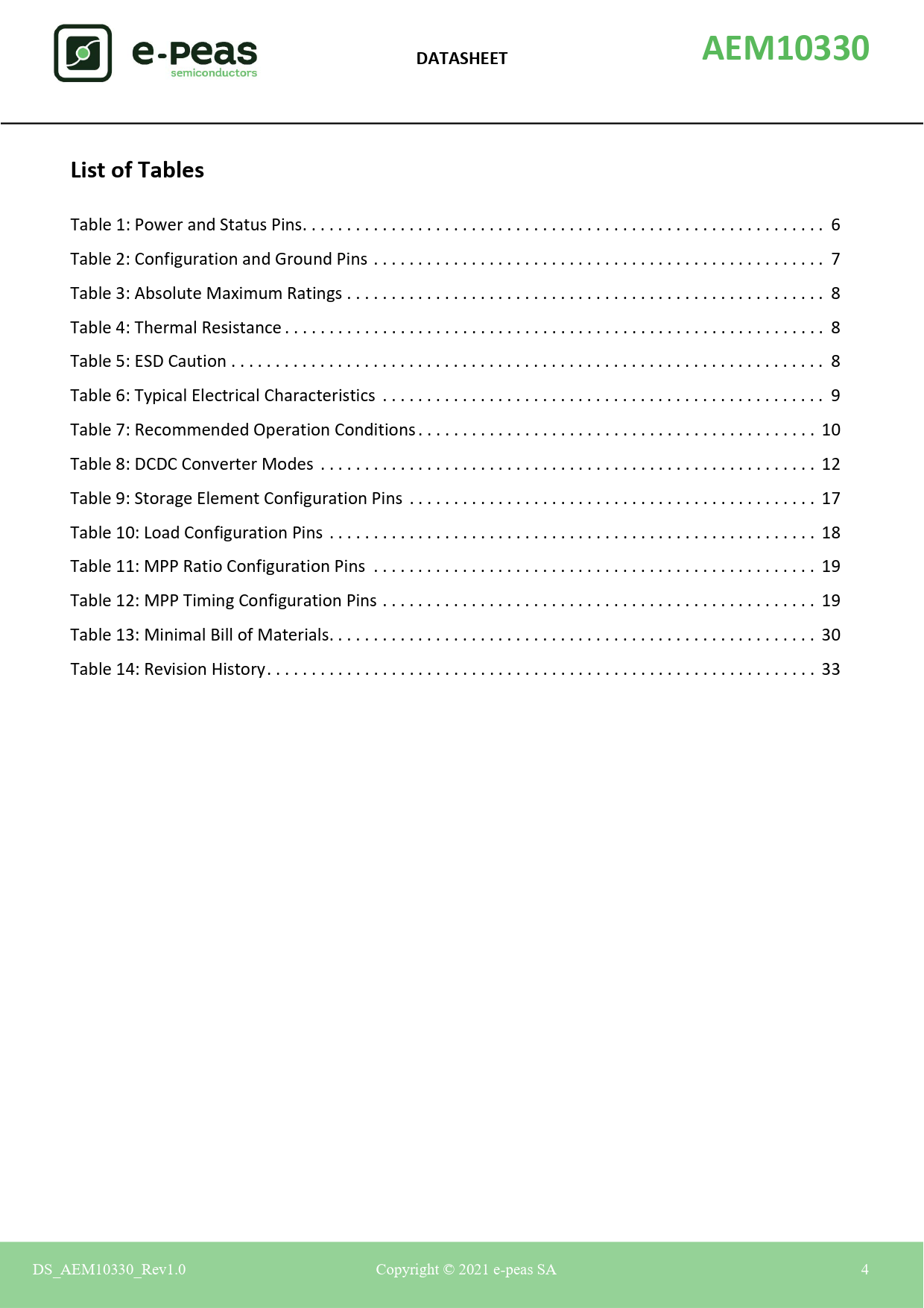 | Pages / Page | 33 / 4 — DATASHEET. AEM10330. List of Tables |