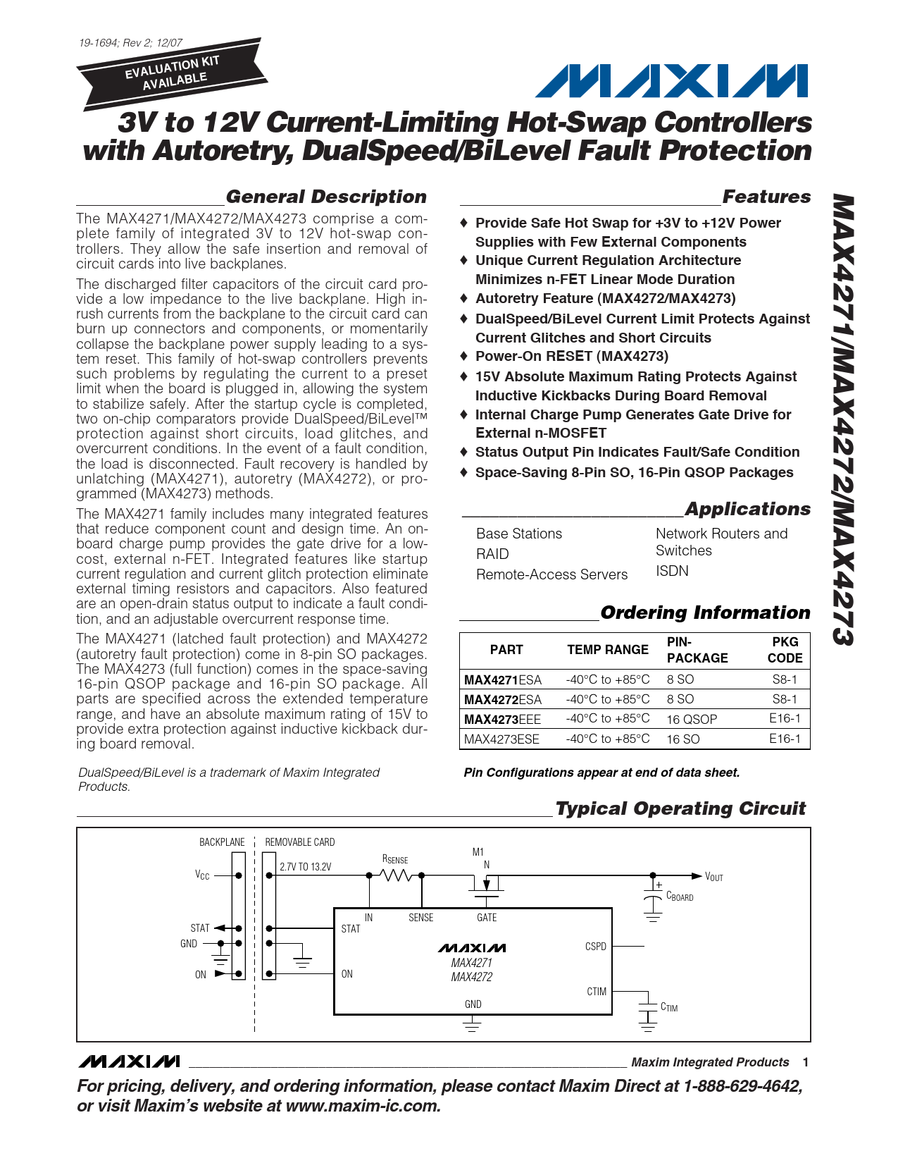 19-1694; Rev 2; 12/07 EVALUATION KITAVAILABLE3V to 12V Current-Limiting Hot-Swap Controllerswith Autoretry, DualSpeed/BiLevel Fault ProtectionMAX4271/MAX4272/MAX4273General DescriptionFeatures The MAX4271/MAX4272/MAX4273 comprise a com- ♦ Provide Safe Hot Swap for +3V to +12V Power plete family of integrated 3V to 12V hot-swap con- Supplies with Few External Components trollers. They allow the safe insertion and removal of circuit cards into live backplanes. ♦ Unique Current Regulation Architecture The discharged filter capacitors of the circuit card pro- Minimizes n-FET Linear Mode Duration vide a low impedance to the live backplane. High in- ♦ Autoretry Feature (MAX4272/MAX4273) rush currents from the backplane to the circuit card can ♦ DualSpeed/BiLevel Current Limit Protects Against burn up connectors and components, or momentarily Current Glitches and Short Circuits collapse the backplane power supply leading to a sys- tem reset. This family of hot-swap controllers prevents ♦ Power-On RESET (MAX4273) such problems by regulating the current to a preset ♦ 15V Absolute Maximum Rating Protects Against limit when the board is plugged in, allowing the system Inductive Kickbacks During Board Removal to stabilize safely. After the startup cycle is completed, two on-chip comparators provide DualSpeed/BiLevel™ ♦ Internal Charge Pump Generates Gate Drive for protection against short circuits, load glitches, and External n-MOSFET overcurrent conditions. In the event of a fault condition, ♦ Status Output Pin Indicates Fault/Safe Condition the load is disconnected. Fault recovery is handled by ♦ unlatching (MAX4271), autoretry (MAX4272), or pro- Space-Saving 8-Pin SO, 16-Pin QSOP Packages grammed (MAX4273) methods. The MAX4271 family includes many integrated features ________________________Applications that reduce component count and design time. An on- Base Stations Network Routers and board charge pump provides the gate drive for a low- Switches cost, external n-FET. Integrated features like startup RAID current regulation and current glitch protection eliminate Remote-Access Servers ISDN external timing resistors and capacitors. Also featured are an open-drain status output to indicate a fault condi- tion, and an adjustable overcurrent response time. Ordering Information The MAX4271 (latched fault protection) and MAX4272 PIN-PKG (autoretry fault protection) come in 8-pin SO packages. PARTTEMP RANGEPACKAGECODE The MAX4273 (full function) comes in the space-saving 16-pin QSOP package and 16-pin SO package. All MAX4271 ESA -40°C to +85°C 8 SO S8-1 parts are specified across the extended temperature MAX4272 ESA -40°C to +85°C 8 SO S8-1 range, and have an absolute maximum rating of 15V to MAX4273 EEE -40°C to +85°C 16 QSOP E16-1 provide extra protection against inductive kickback dur- ing board removal. MAX4273ESE -40°C to +85°C 16 SO E16-1 DualSpeed/BiLevel is a trademark of Maxim Integrated Pin Configurations appear at end of data sheet. Products. Typical Operating Circuit BACKPLANE REMOVABLE CARD M1 RSENSE N 2.7V TO 13.2V VCC VOUT CBOARD IN SENSE GATE STAT STAT GND CSPD MAX4271 ON ON MAX4272 CTIM GND CTIM ________________________________________________________________ Maxim Integrated Products1For pricing, delivery, and ordering information, please contact Maxim Direct at 1-888-629-4642, or visit Maxim’s website at www.maxim-ic.com.