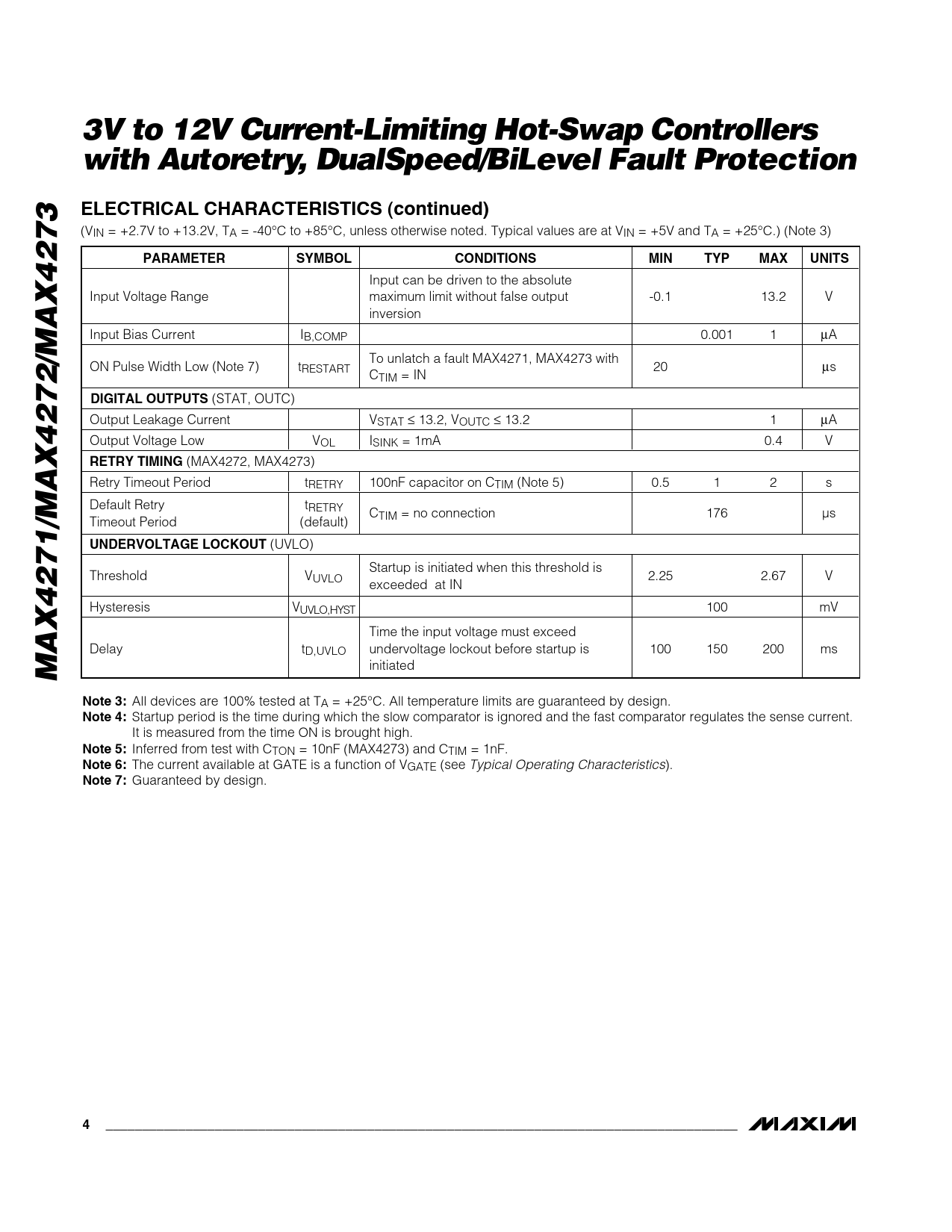 3V to 12V Current-Limiting Hot-Swap Controllers with Autoretry, DualSpeed/BiLevel Fault ProtectionELECTRICAL CHARACTERISTICS (continued) (VIN = +2.7V to +13.2V, TA = -40°C to +85°C, unless otherwise noted. Typical values are at VIN = +5V and TA = +25°C.) (Note 3) PARAMETERSYMBOLCONDITIONSMINTYPMAXUNITS Input can be driven to the absolute Input Voltage Range maximum limit without false output -0.1 13.2 V inversion Input Bias Current IB,COMP 0.001 1 μA To unlatch a fault MAX4271, MAX4273 with ON Pulse Width Low (Note 7) tRESTART 20 μs CTIM = IN DIGITAL OUTPUTS (STAT, OUTC) Output Leakage Current VSTAT ≤ 13.2, VOUTC ≤ 13.2 1 μA Output Voltage Low VOL ISINK = 1mA 0.4 V RETRY TIMING (MAX4272, MAX4273) Retry Timeout Period tRETRY 100nF capacitor on CTIM (Note 5) 0.5 1 2 s Default Retry tRETRY CTIM = no connection 176 µs Timeout Period (default) UNDERVOLTAGE LOCKOUT (UVLO) Startup is initiated when this threshold is Threshold VUVLO 2.25 2.67 V exceeded at IN Hysteresis V U V LO,H YS T 100 mV Time the input voltage must exceed Delay tD,UVLO undervoltage lockout before startup is 100 150 200 ms MAX4271/MAX4272/MAX4273 initiated Note 3: All devices are 100% tested at TA = +25°C. All temperature limits are guaranteed by design. Note 4: Startup period is the time during which the slow comparator is ignored and the fast comparator regulates the sense current. It is measured from the time ON is brought high. Note 5: Inferred from test with CTON = 10nF (MAX4273) and CTIM = 1nF. Note 6: The current available at GATE is a function of VGATE (see Typical Operating Characteristics). Note 7: Guaranteed by design. 4_______________________________________________________________________________________